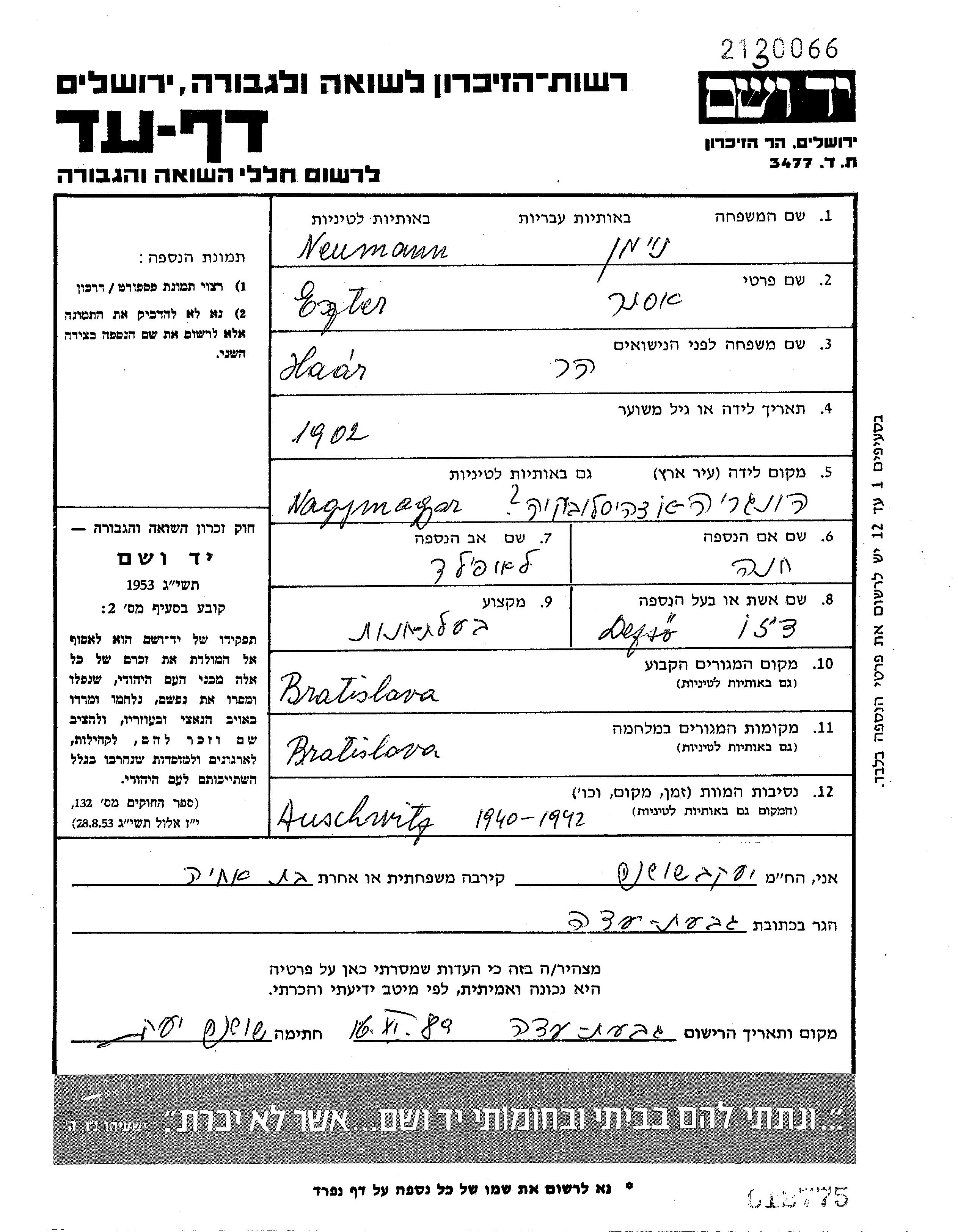 Yad Vashem - Pages of Testimony Names Memorial Collection