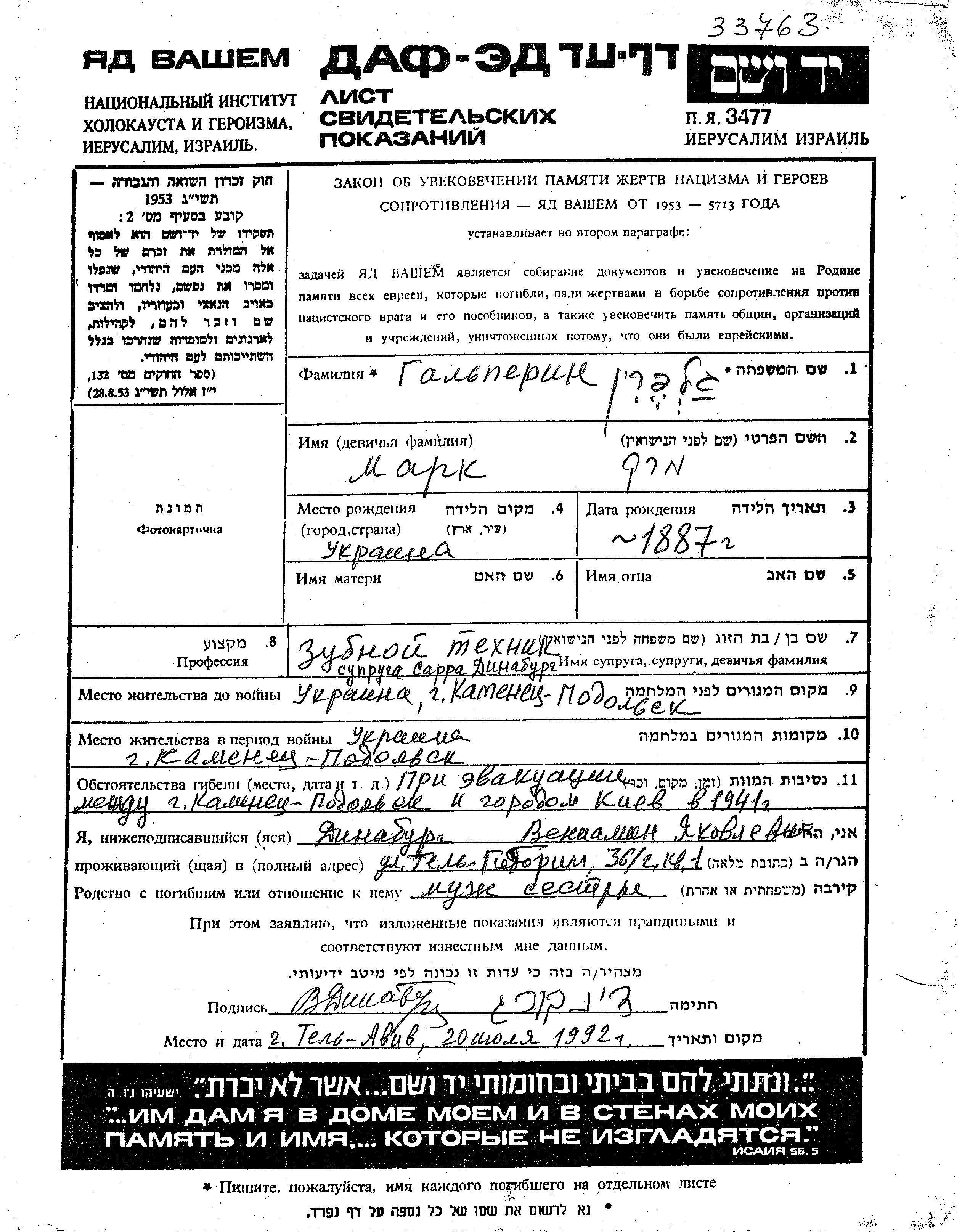 Galperin Mark 1887 Kamenets Podolskiy, Ukraine (URSS) Feuille de témoignage