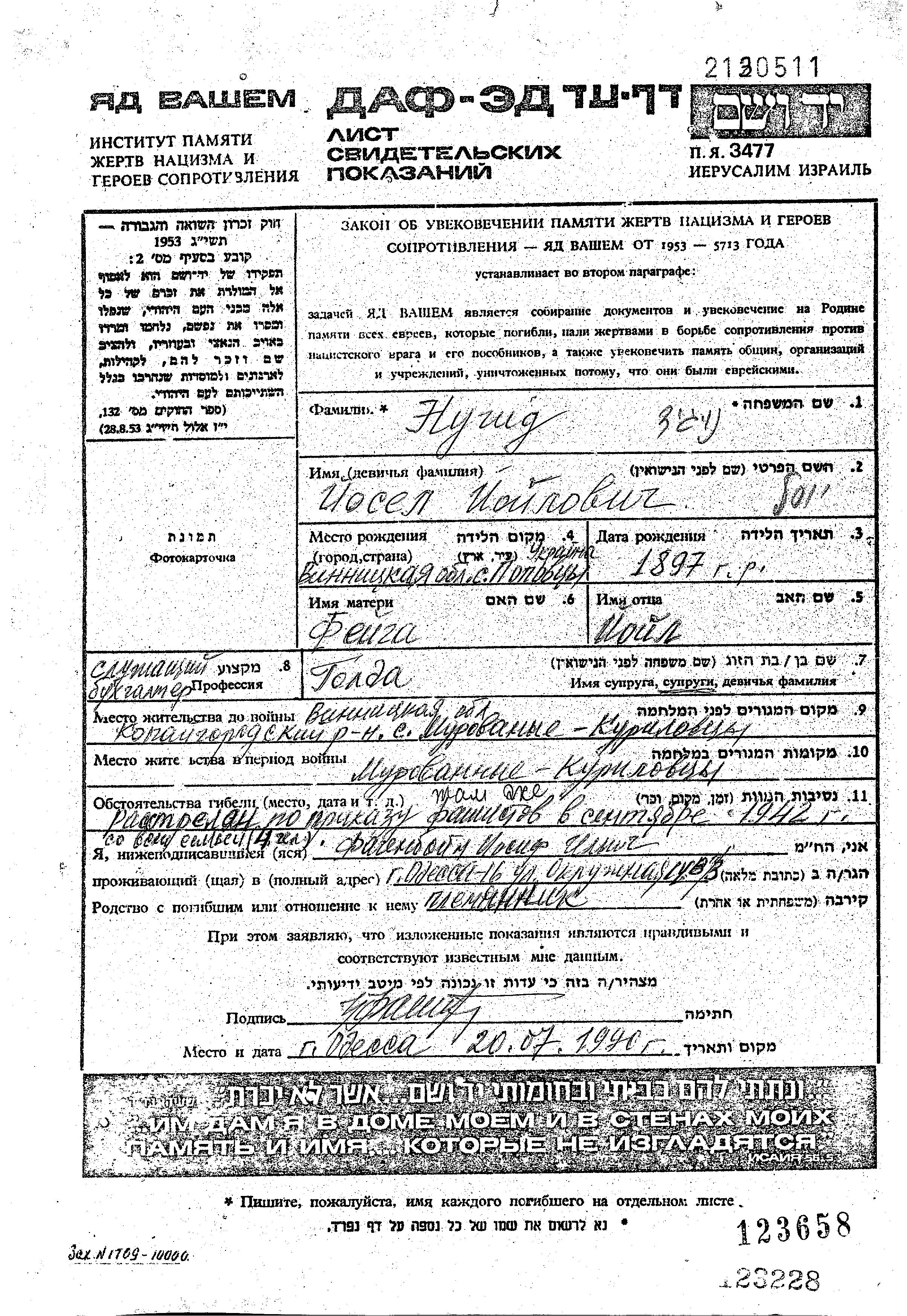 Nugid Ioselei 1897 Mur Kirilovtsy, Ukraine (URSS) Feuille de témoignage