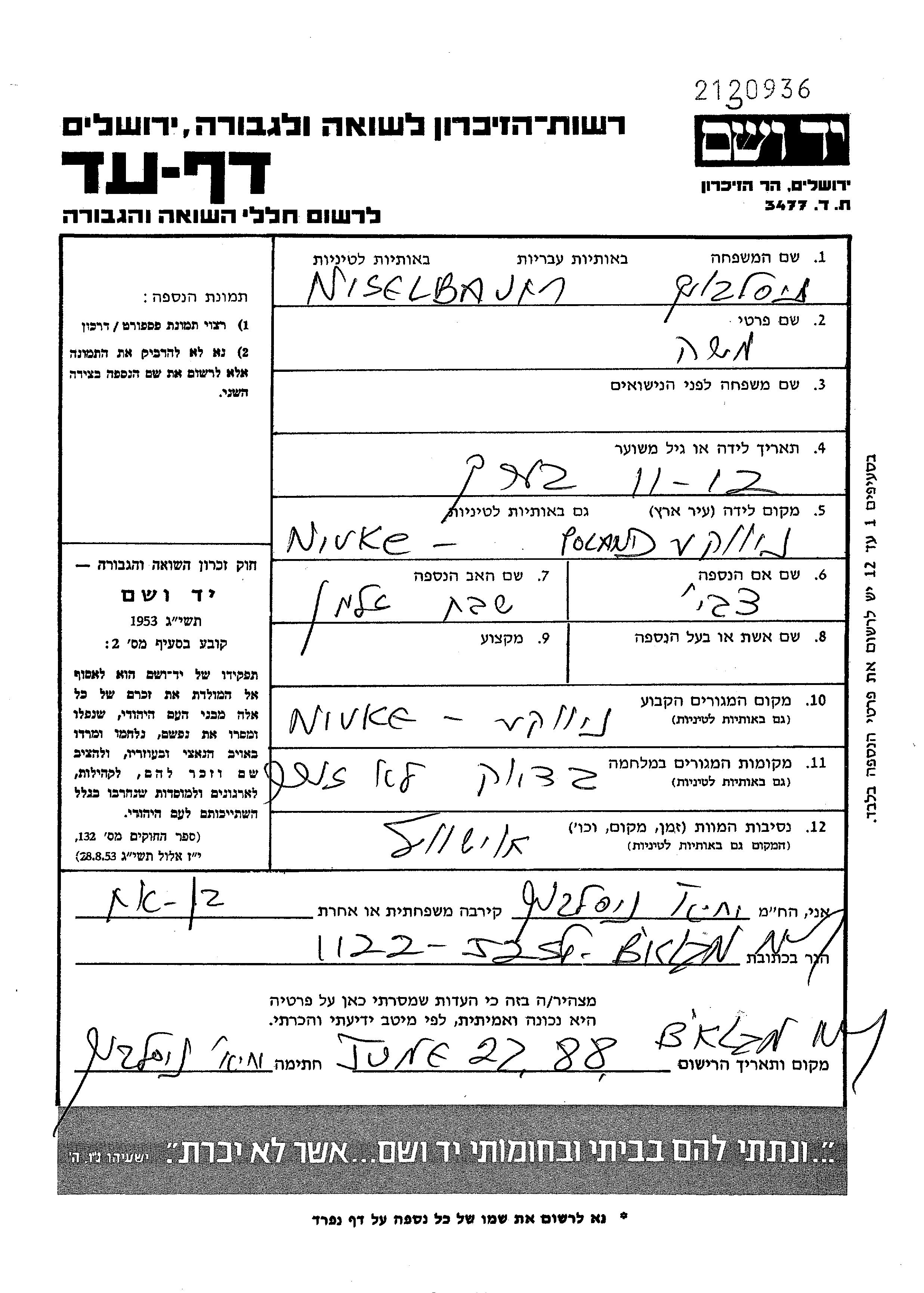 Niselbaum Moshe Niwki, Pologne Feuille de témoignage