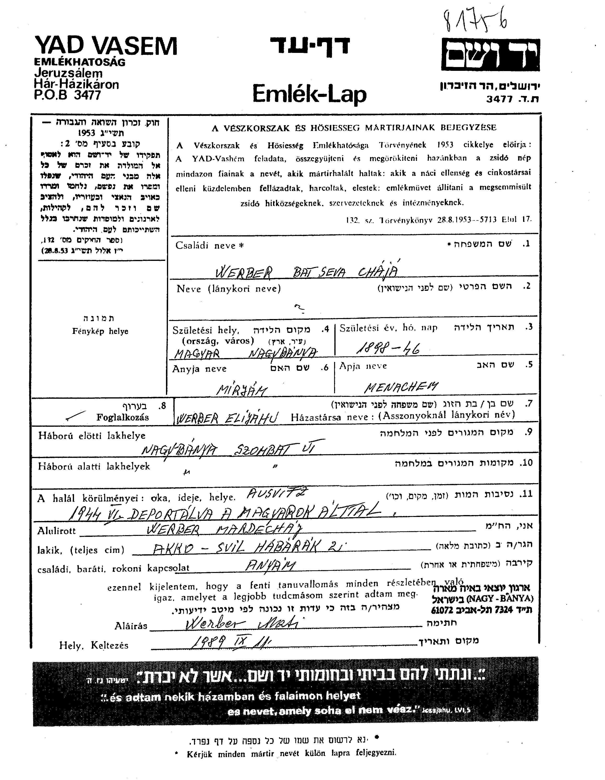 Bat Seva Chaja Werber est née à Nagybánya, Roumanie en 1898, fille de Menachem et de Mirjam. Elle était Mariée à Elijahu. Avant la seconde guerre mondiale elle vivait à Nagybánya, Roumanie. Pendant la guerre, elle était à Nagybánya, Roumanie.