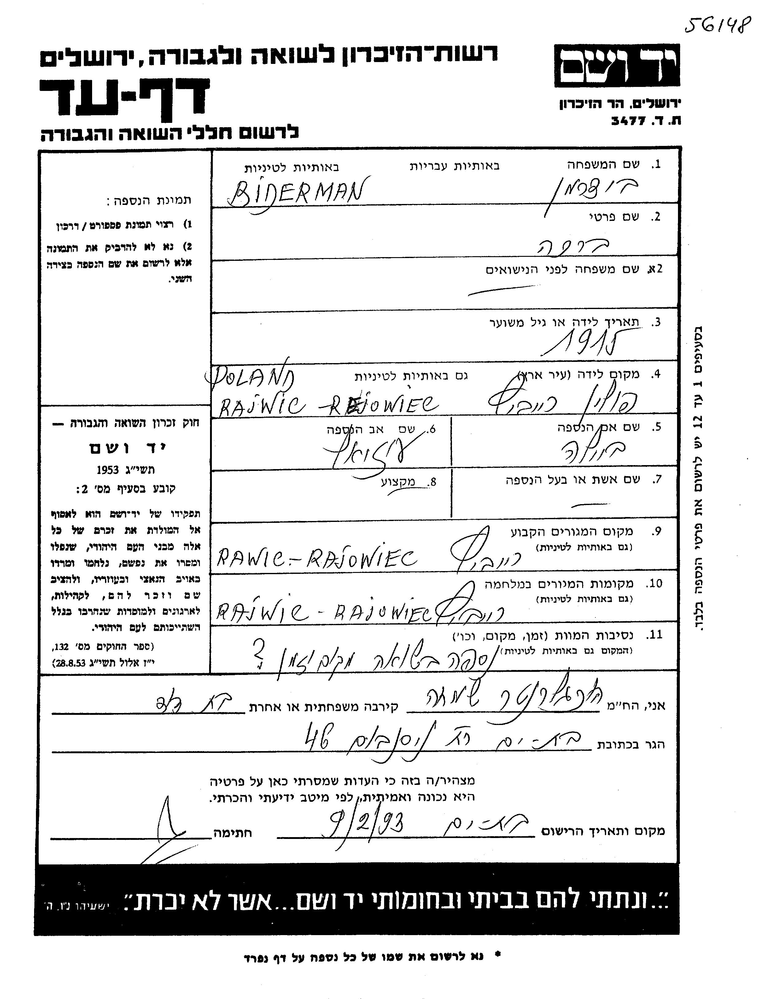 Biderman Brakha 1915 Rejowiec, Pologne Feuille de témoignage