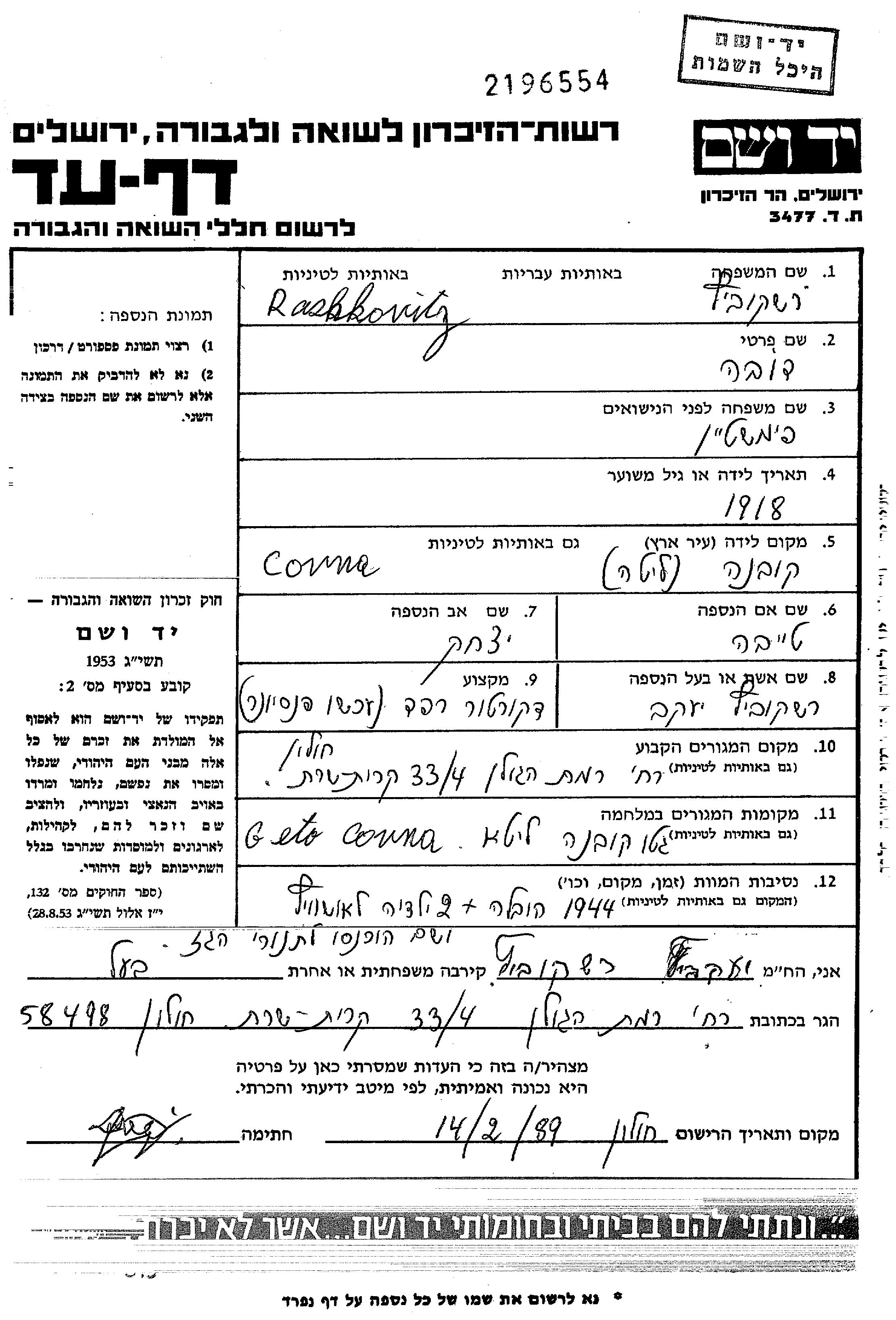 Yad Vashem - Pages of Testimony Names Memorial Collection