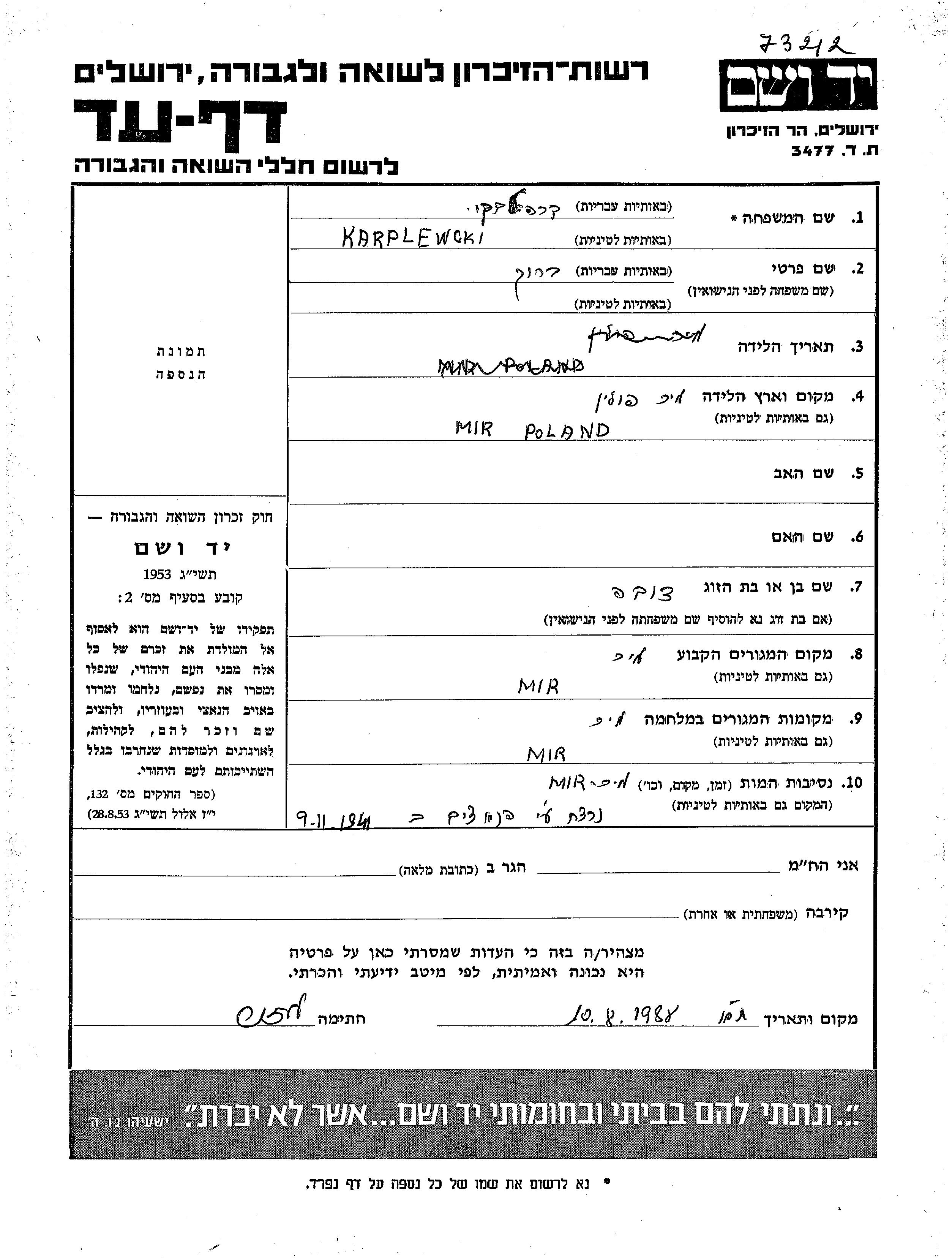 Karpilovski Barukh Mir, Pologne Feuille de témoignage