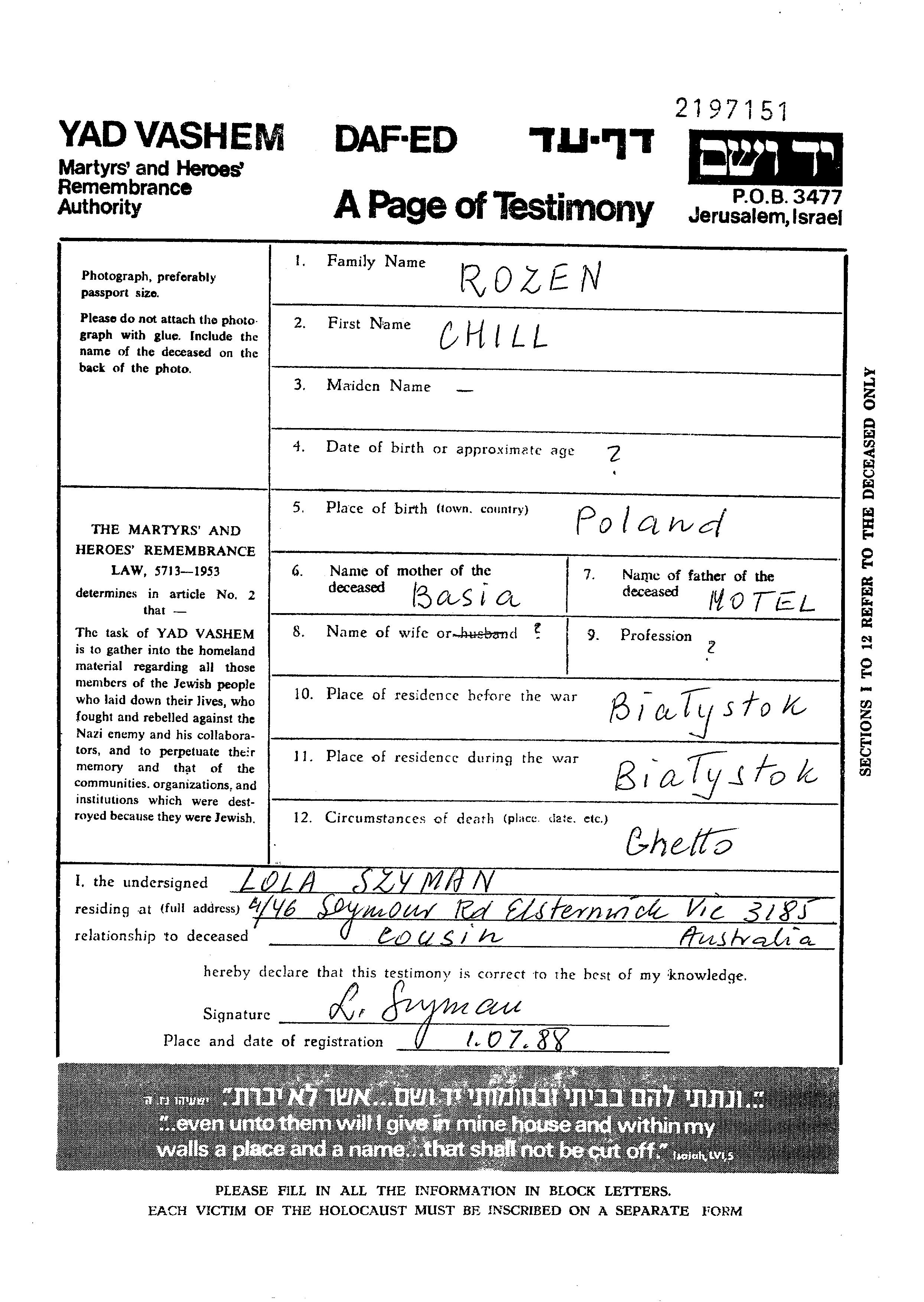 Chill Rozen est né à Pologne, fils de Motel et de Basia. Avant la seconde guerre mondiale il vivait à Bialystok, Pologne. Au cours de la guerre, il était à Bialystok, Pologne.