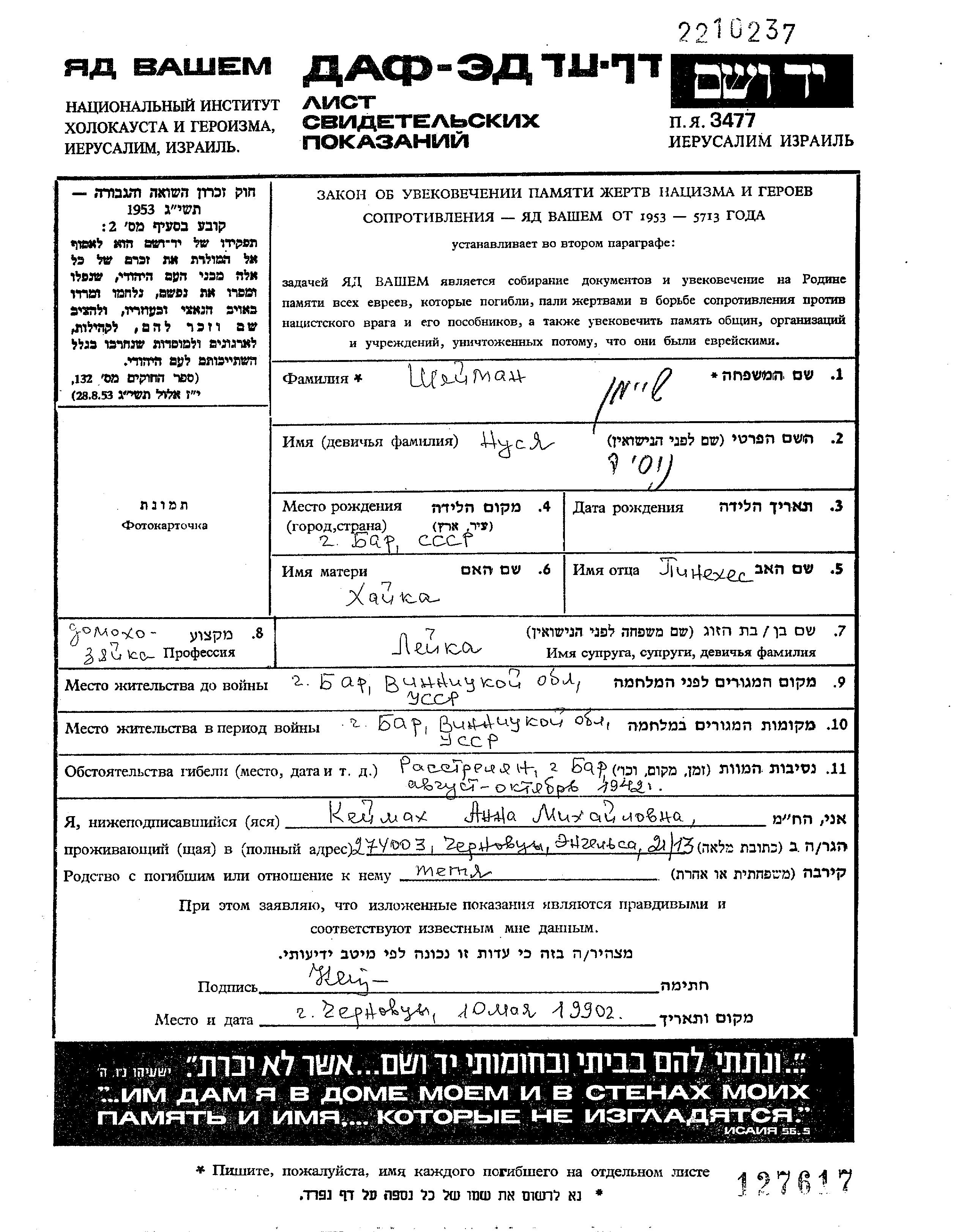 Sheiman Nusya Nusia Bar, Ukraine (URSS) Feuille de témoignage