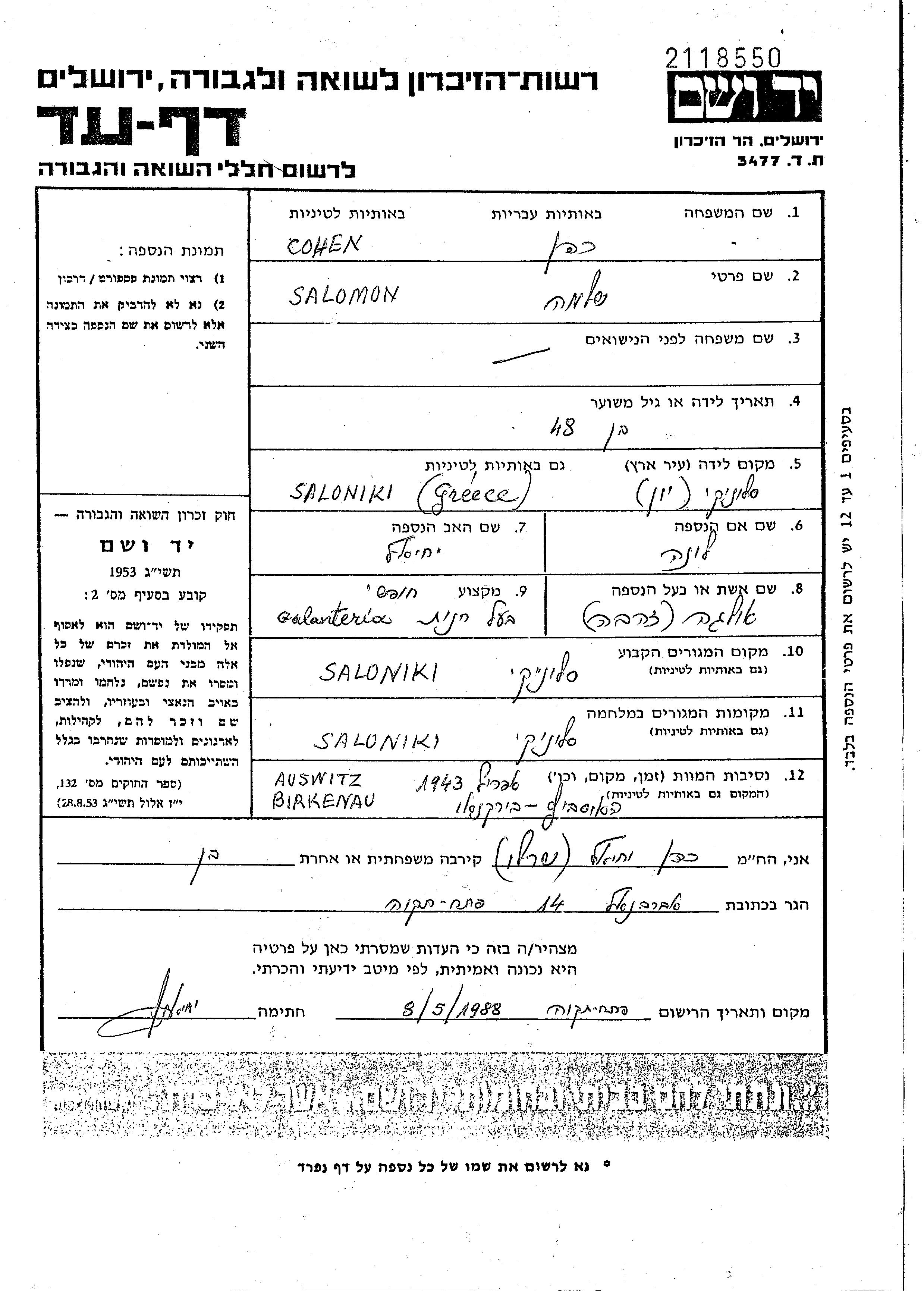 Cohen Salomon Saloniki, Grèce Feuille de témoignage