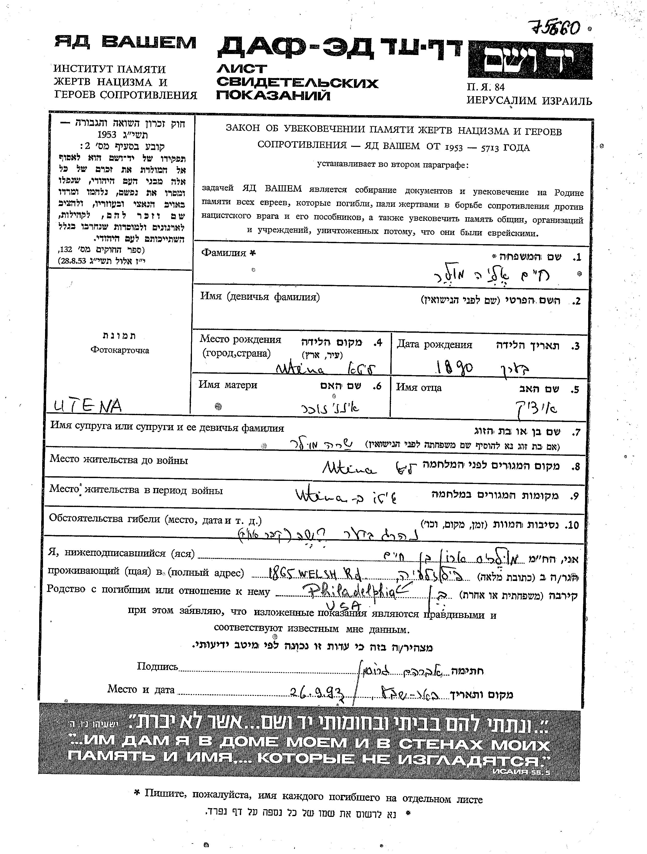 Muler Chaim Elia Alia 1890 Utena, Lituanie Feuille de témoignage