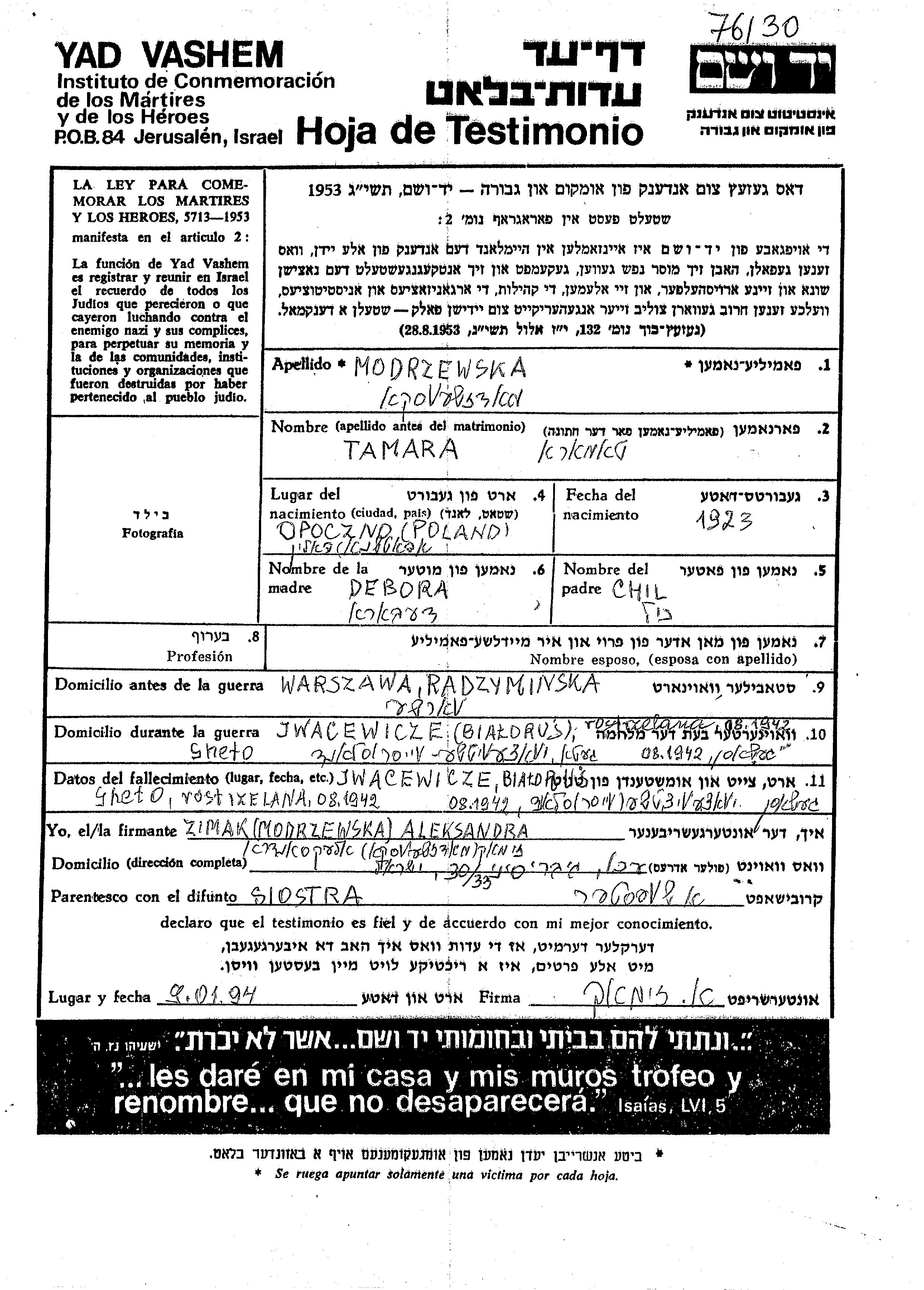 Modrzewski Tamara 1923 Warszawa, Pologne Feuille de témoignage