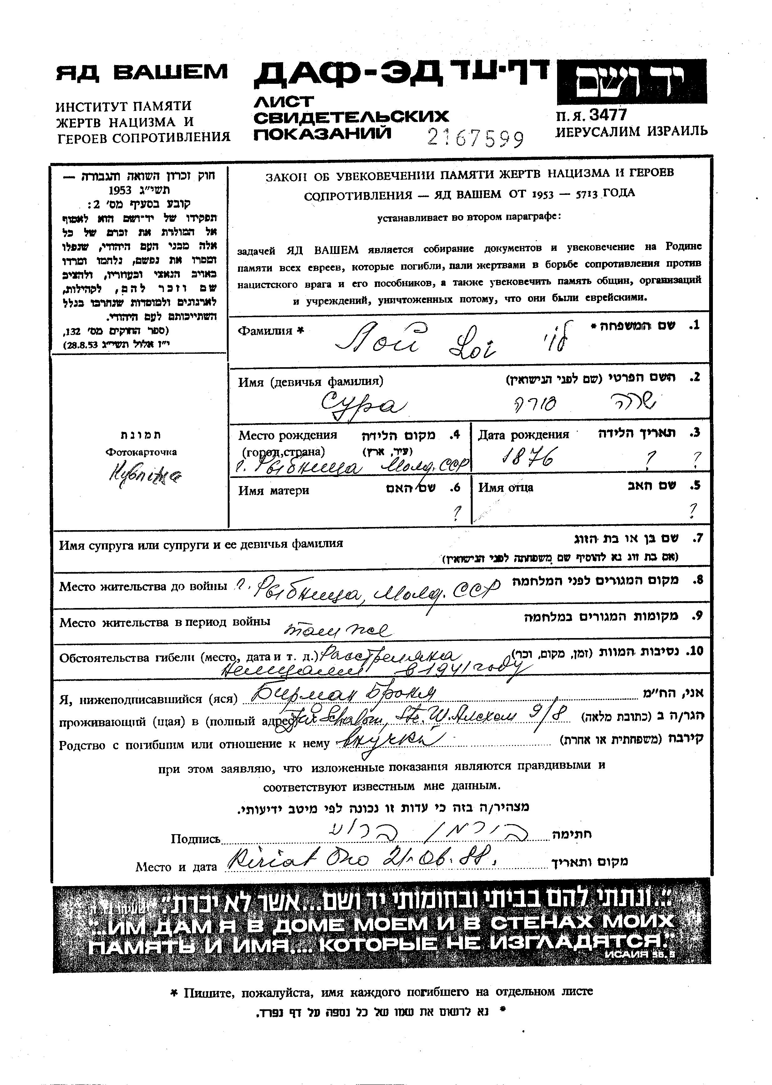Sura Loi Levi est née à Rybnitsa, Ukraine (URSS) en 1876. Avant la seconde guerre mondiale elle vivait à Rybnitsa, Ukraine (URSS). Pendant la guerre, elle était à Rybnitsa, Ukraine (URSS).