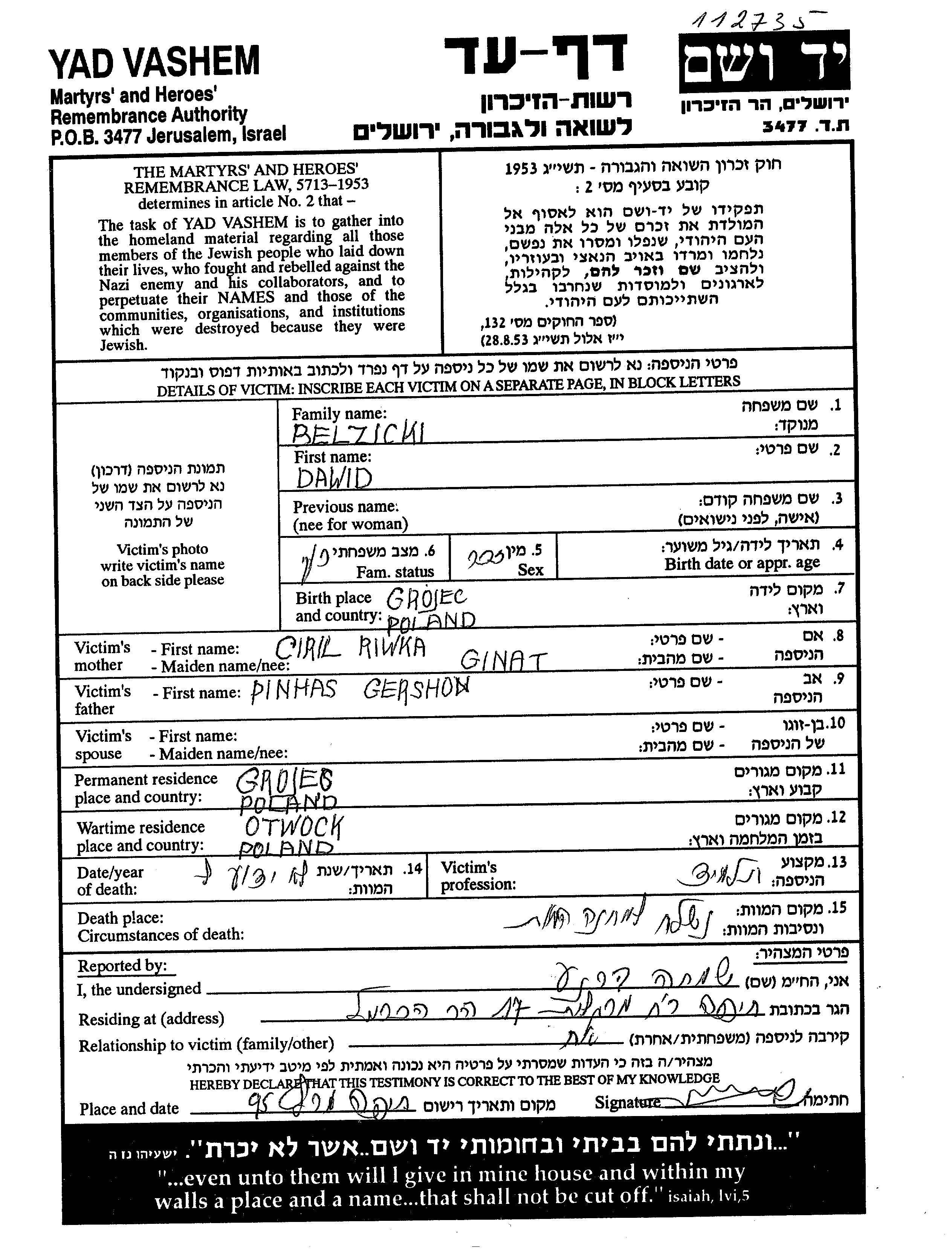 Belzicki David Grojec, Pologne Feuille de témoignage
