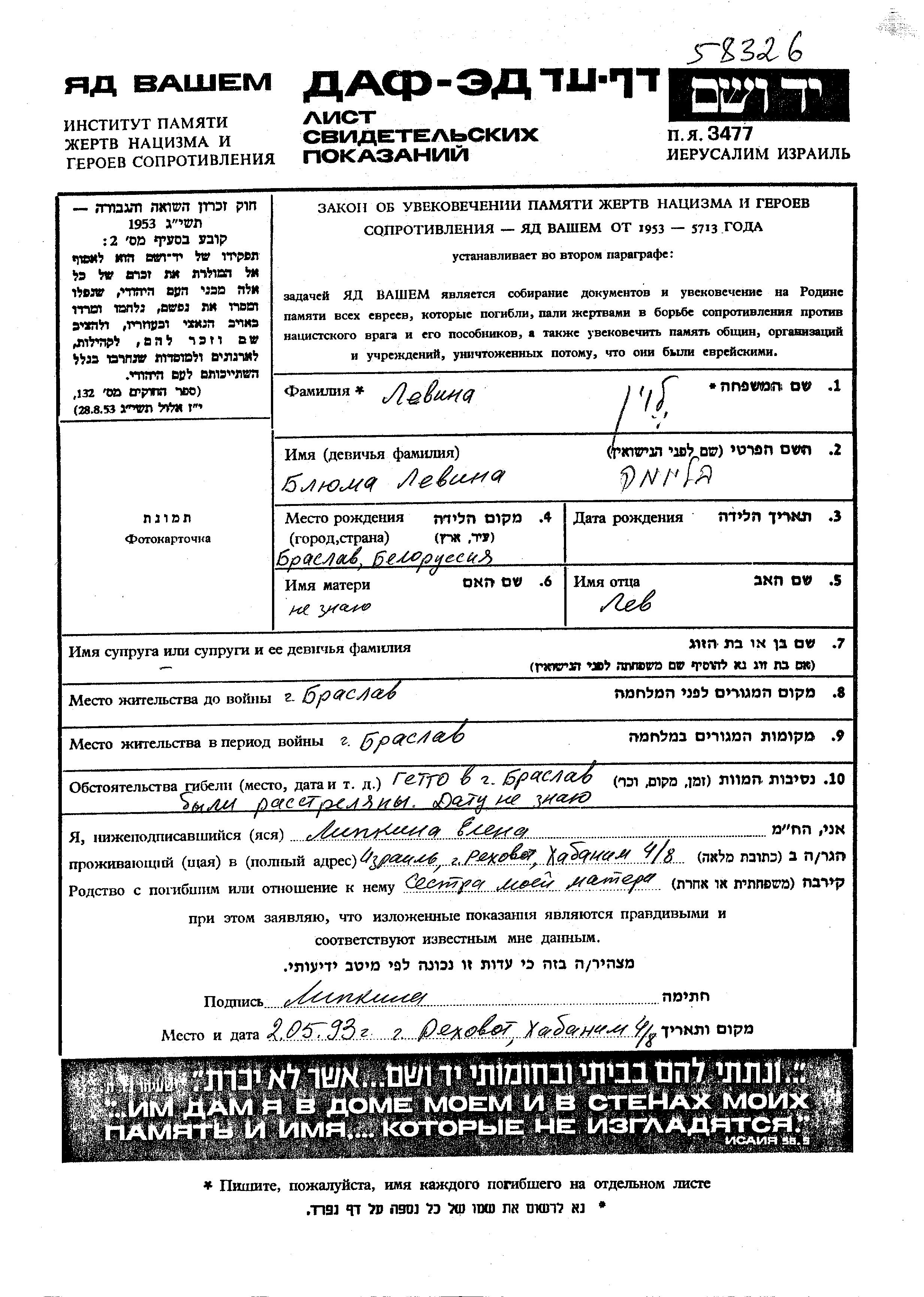 Levin Bluma Braslaw, Pologne Feuille de témoignage