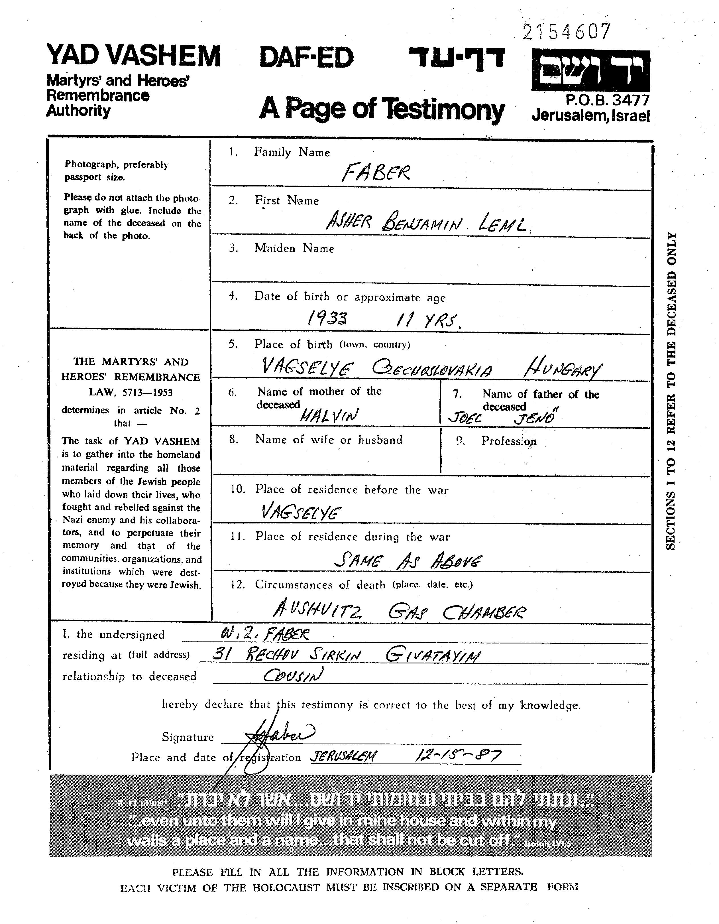 Faber Benjamin Leml Asher 1933 Vagsellye, Tchécoslovaquie Feuille de témoignage