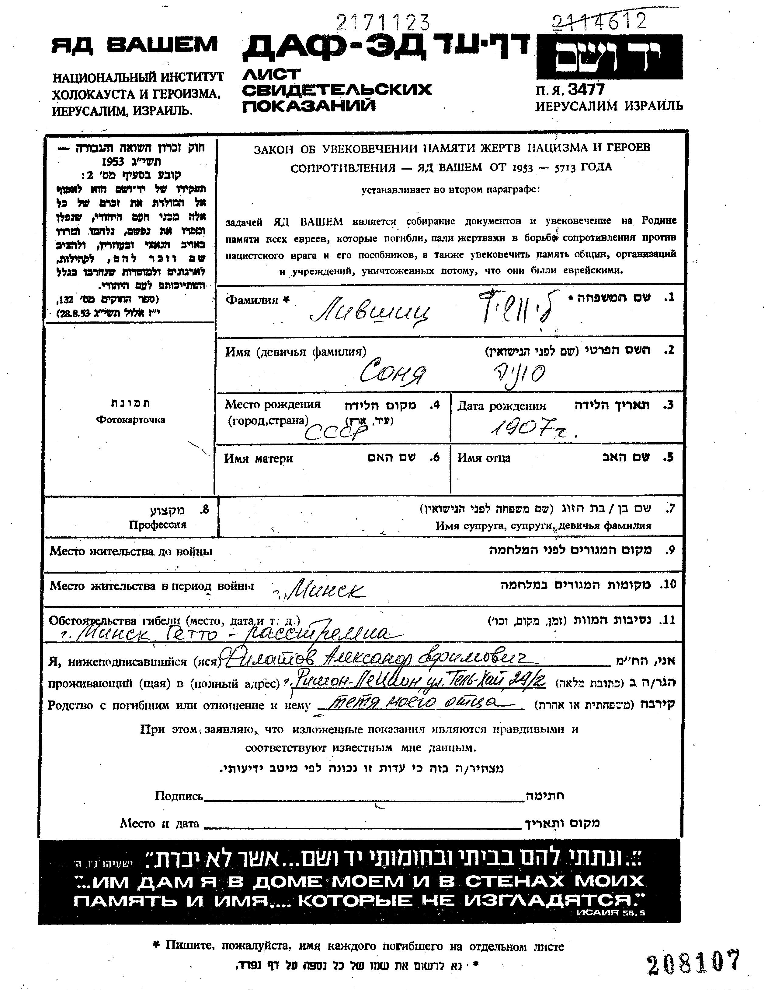 Livshitz Sonya 1907 endroit inconnu, Feuille de témoignage