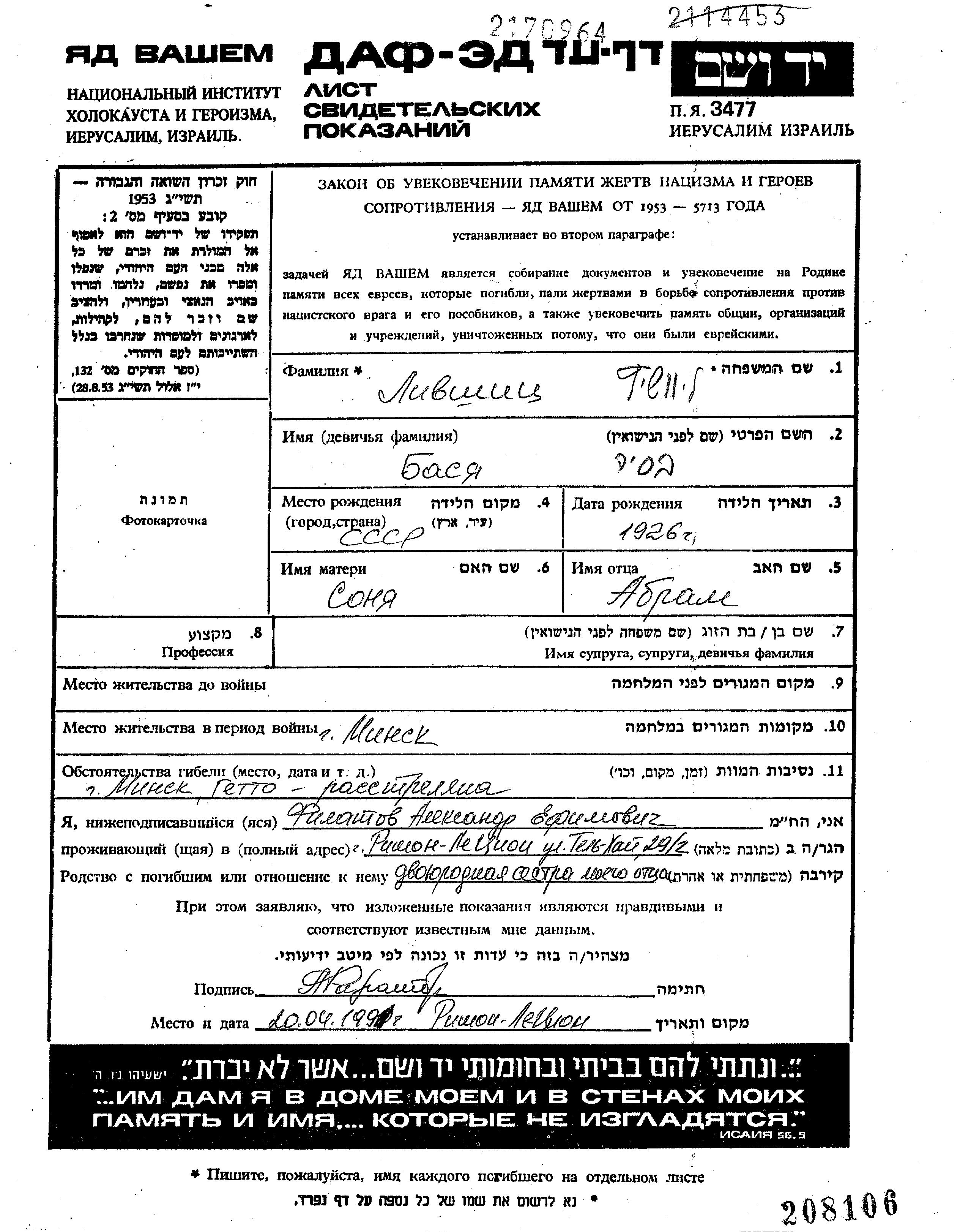 Livshitz Basya 1926 endroit inconnu, Feuille de témoignage