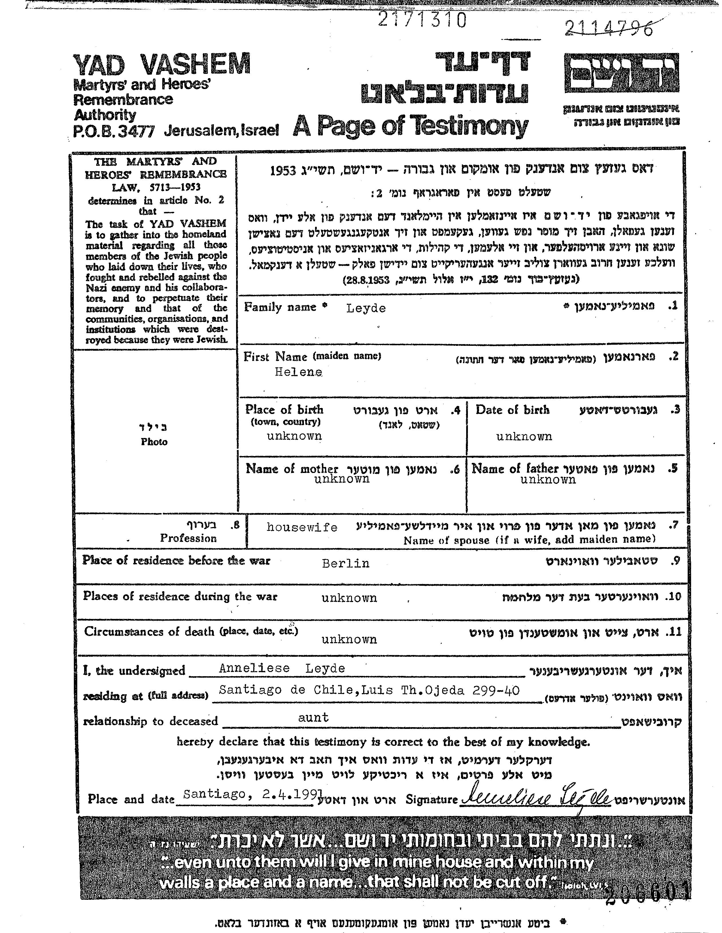 Leyde Helene Berlin, Allemagne Feuille de témoignage