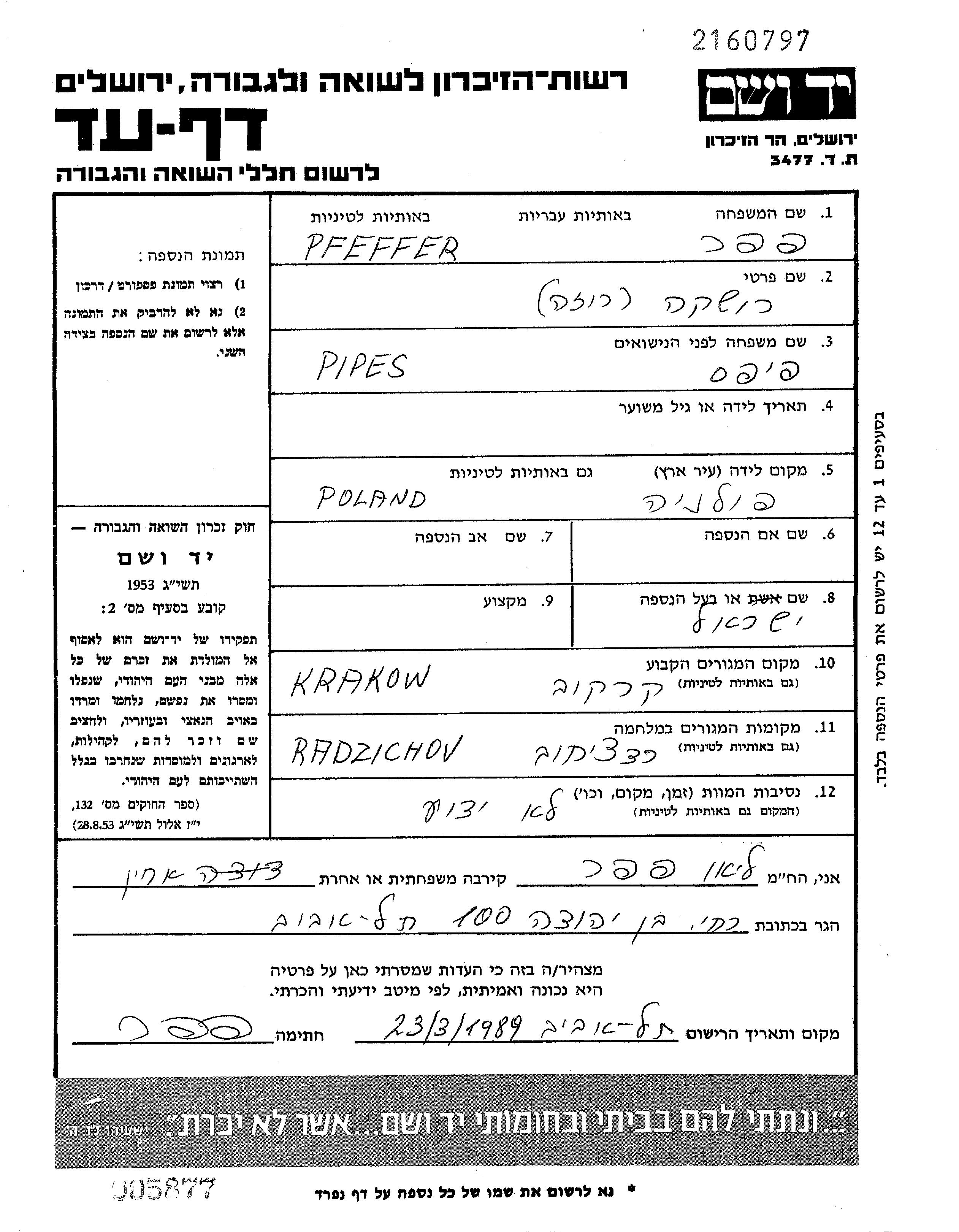 Pfeffer Rakhel Roza Krakow, Pologne Feuille de témoignage