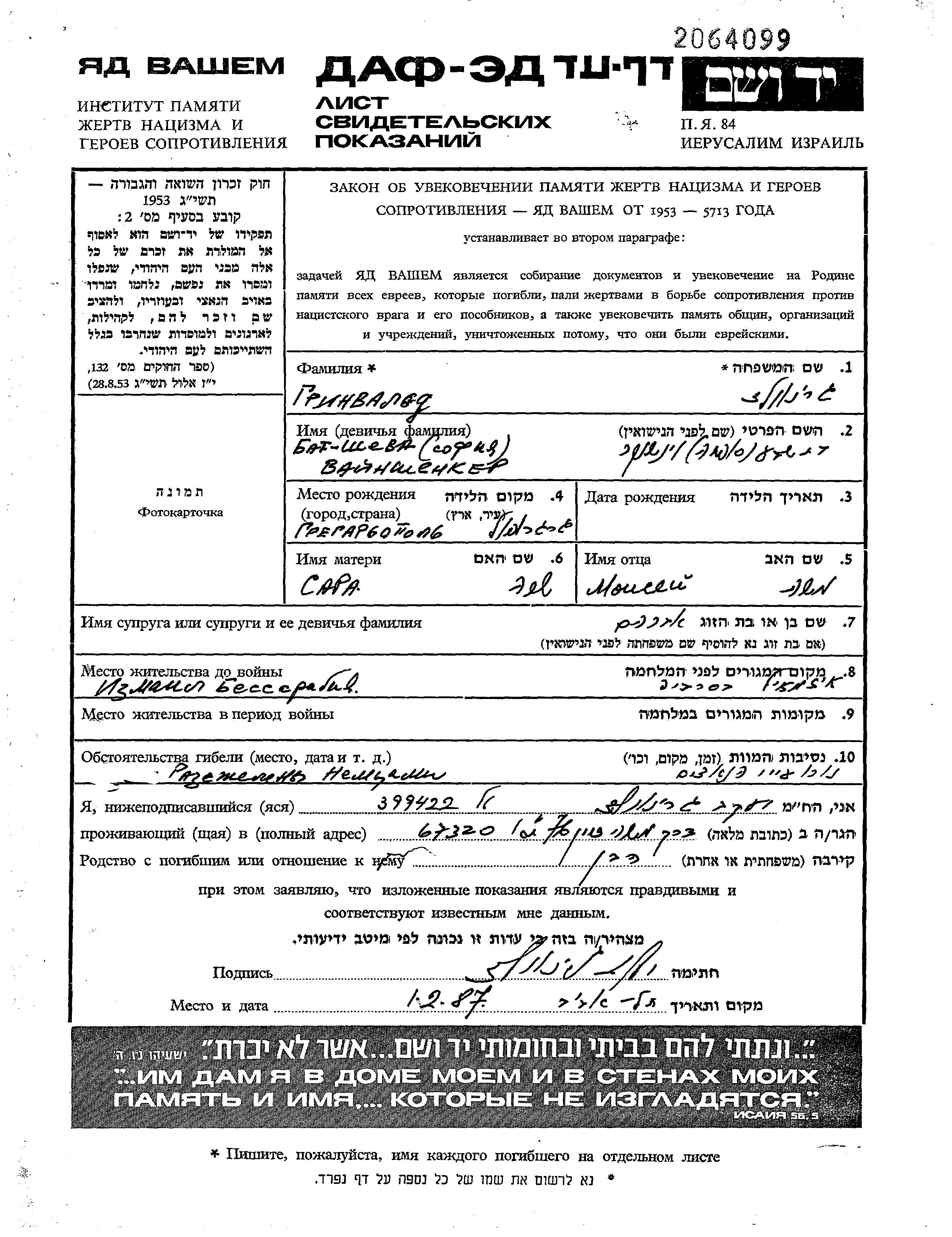 Batsheva Sofia Grinvald née Vainshenker est née à Grigoriopol, Ukraine (URSS), fille de Moisei et de Sara. Elle était Mariée à Abram. Avant la seconde guerre mondiale elle vivait à Ismail, Roumanie.