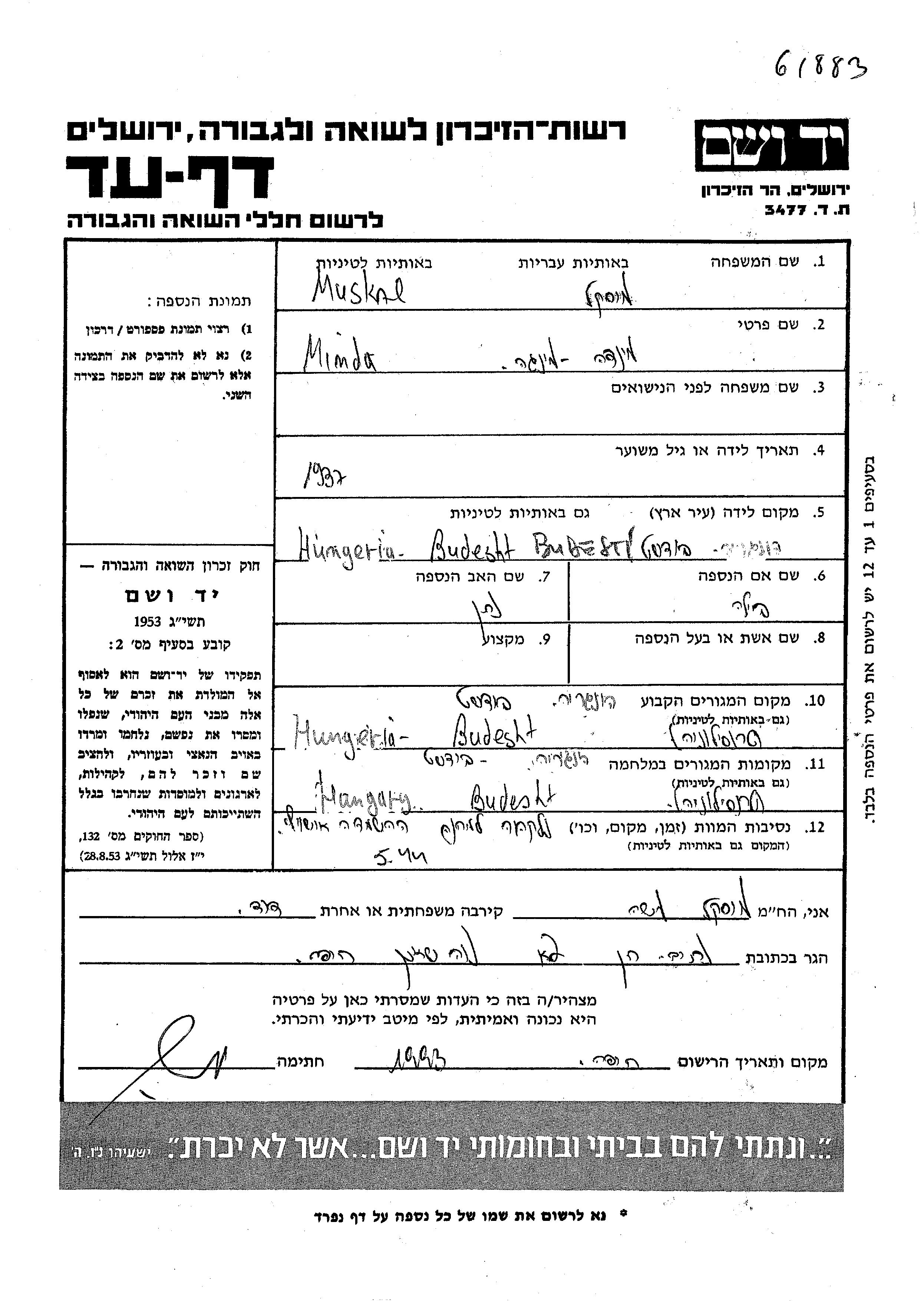 Muskal Minda 1937 Budesti, Roumanie Feuille de témoignage