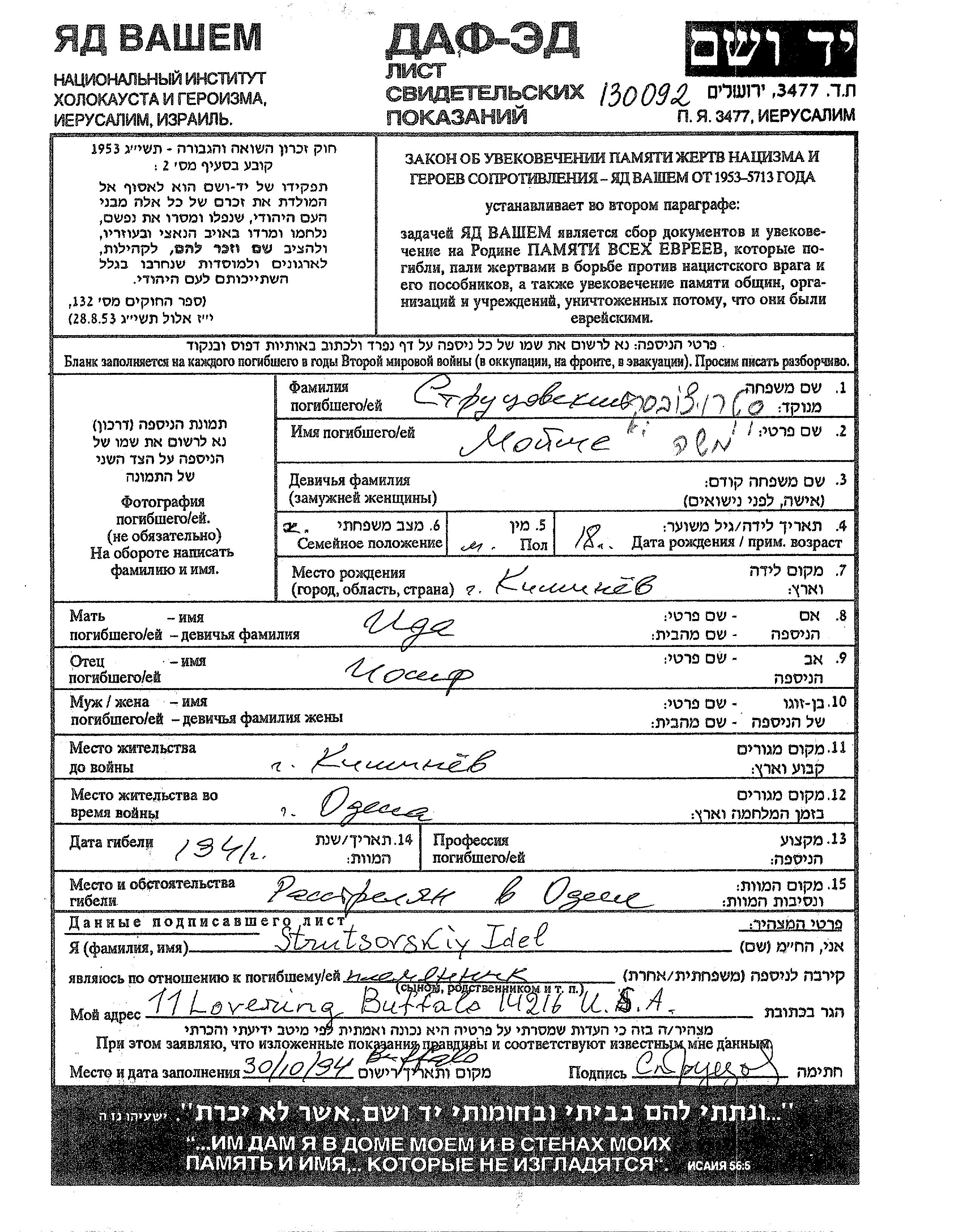 Strutzovski Moishe 1923 Kishinev, Roumanie Feuille de témoignage