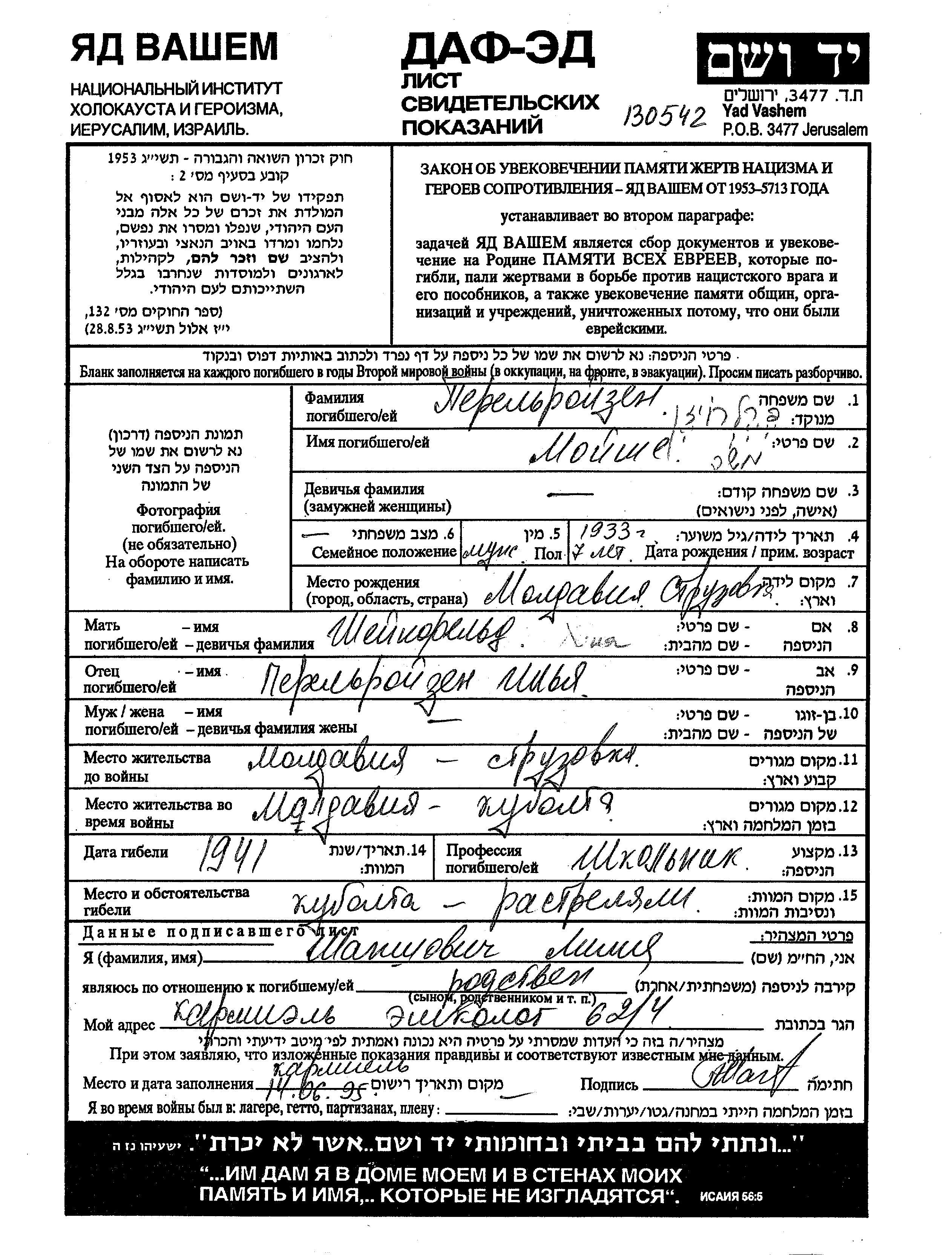 Yad Vashem - Pages of Testimony Names Memorial Collection