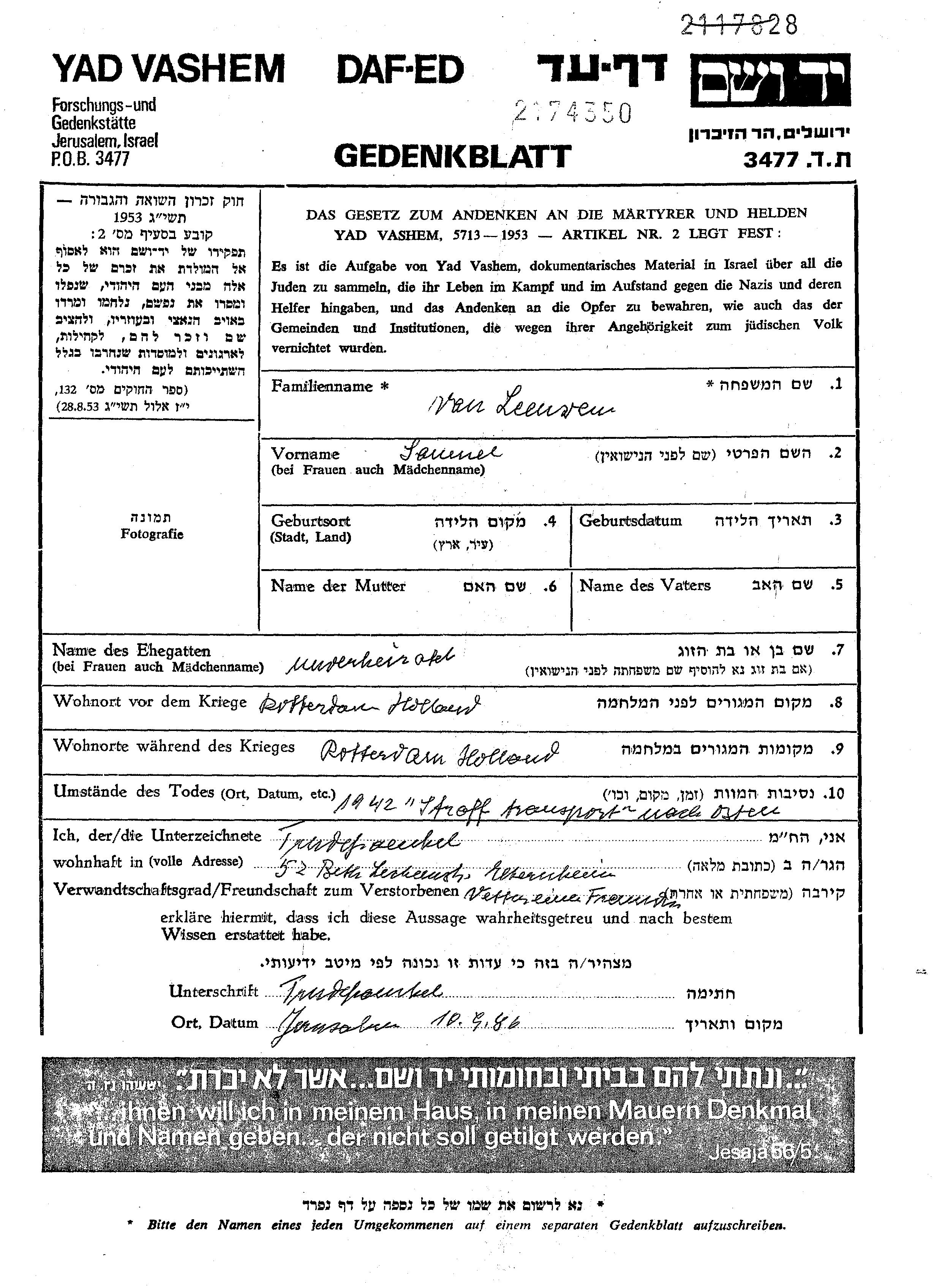 Samuel Leeuwen van. Il était Célibataire. Avant la seconde guerre mondiale il vivait à Rotterdam, Pays-Bas. Au cours de la guerre, il était à Rotterdam, Pays-Bas.