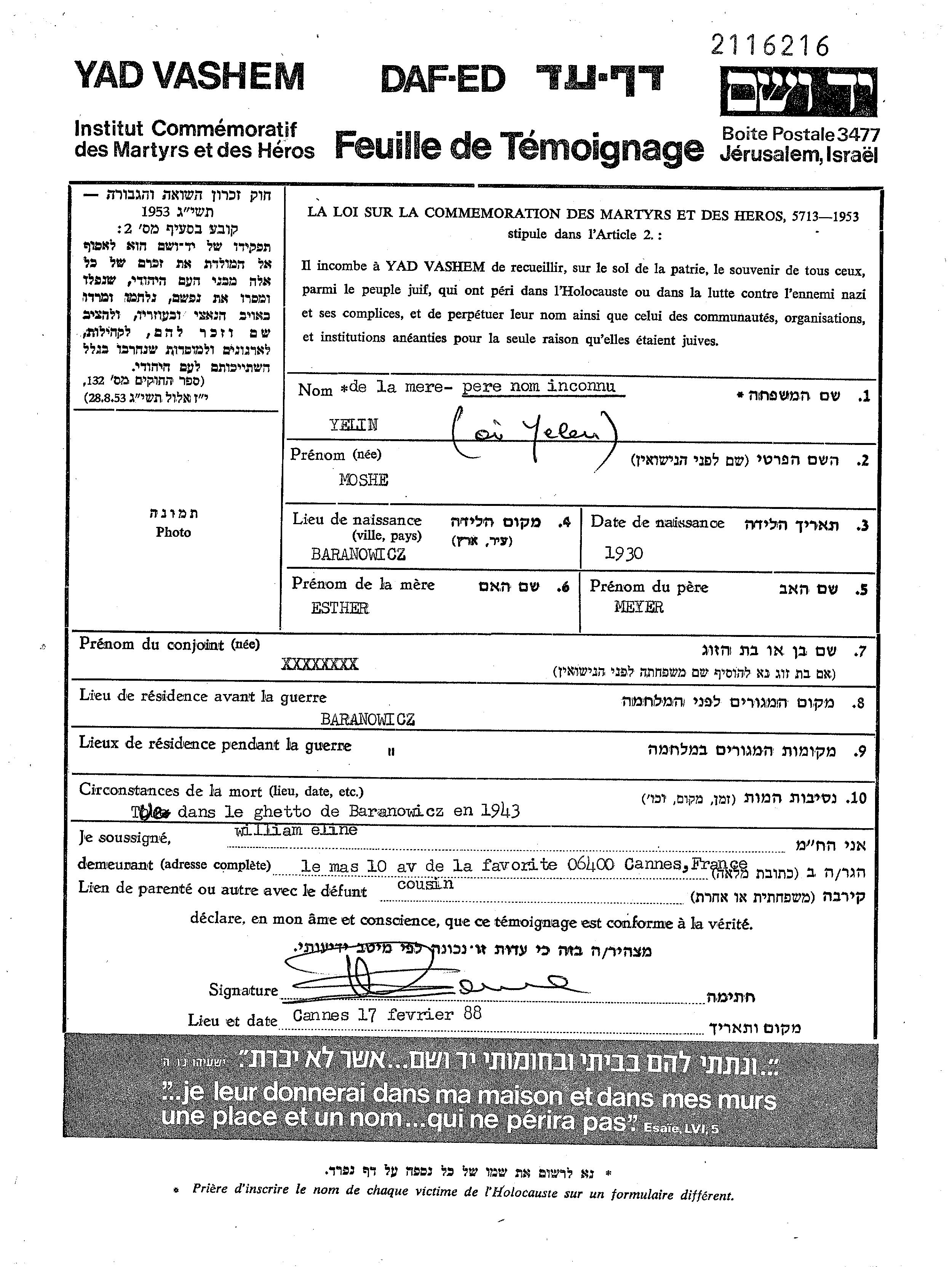 Yelin Moshe 1930 Baranowicze, Pologne Feuille de témoignage