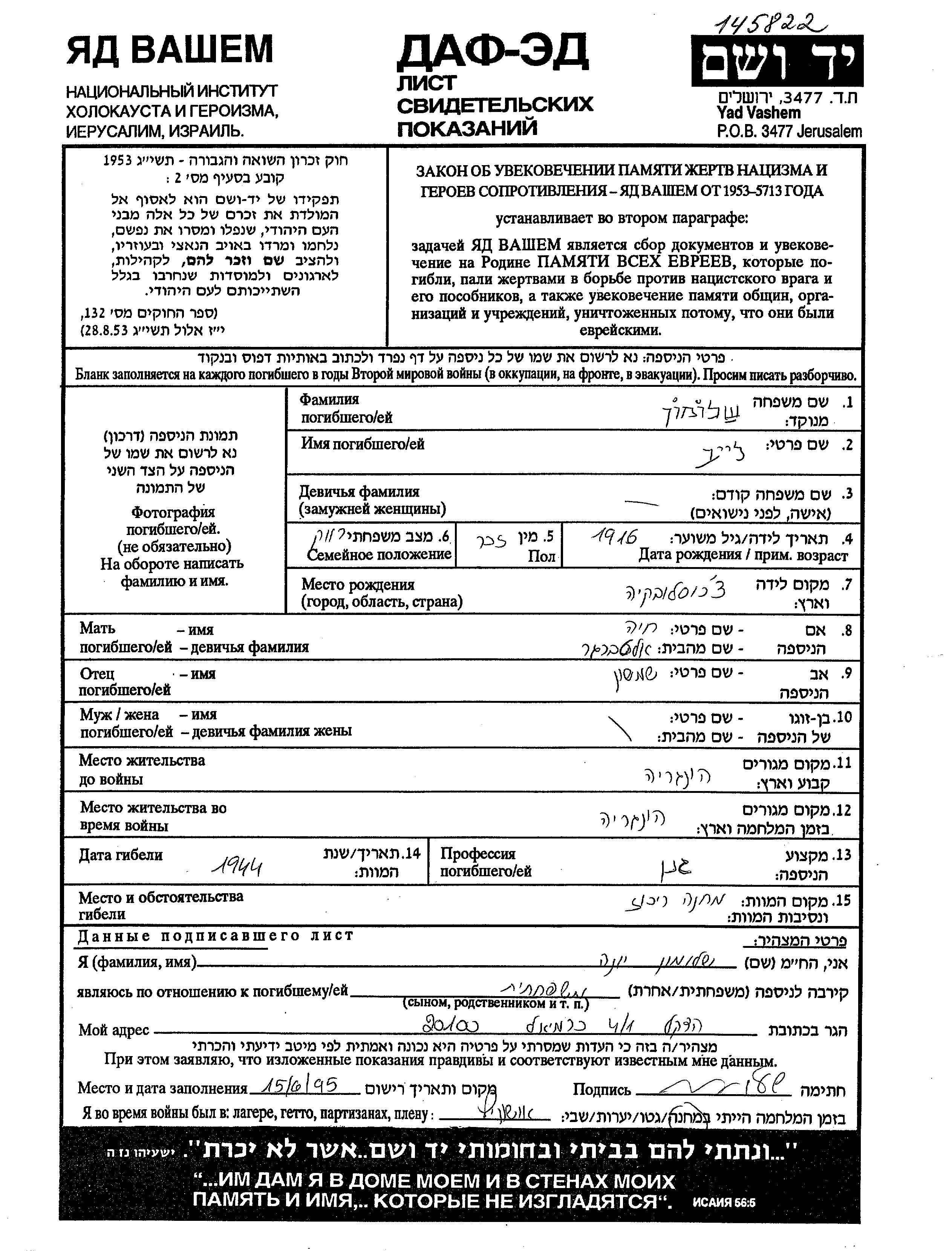 Yad Vashem - Pages of Testimony Names Memorial Collection