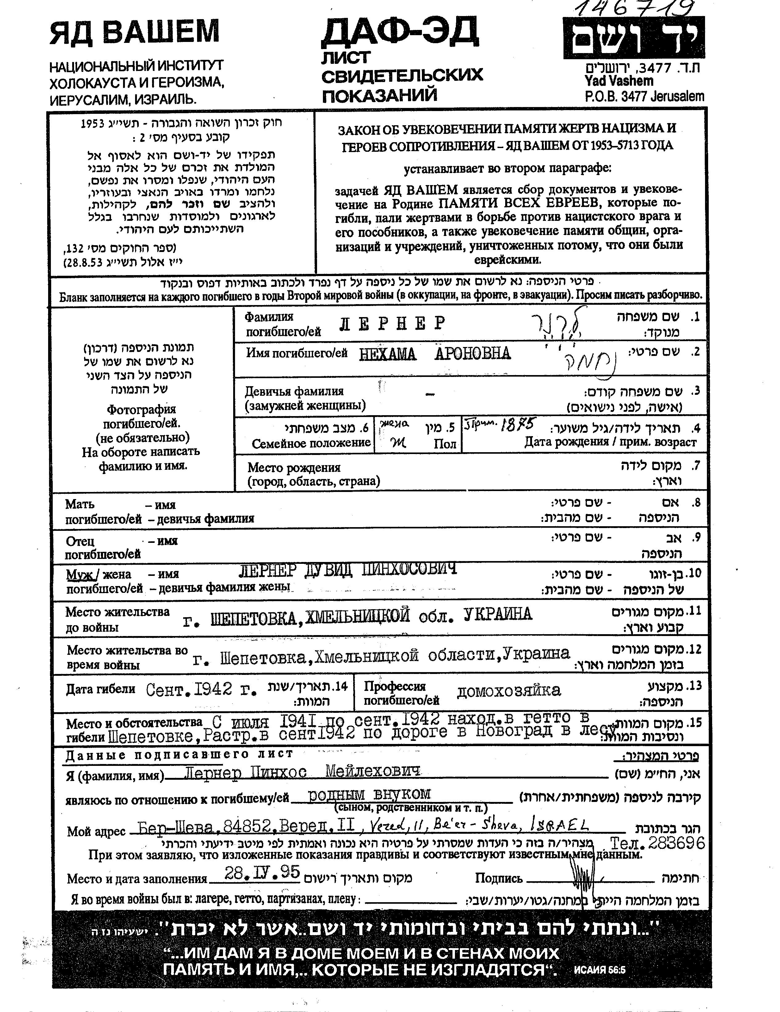 Lerner Nekhama 1875 Shepetovka, Ukraine (URSS) Feuille de témoignage