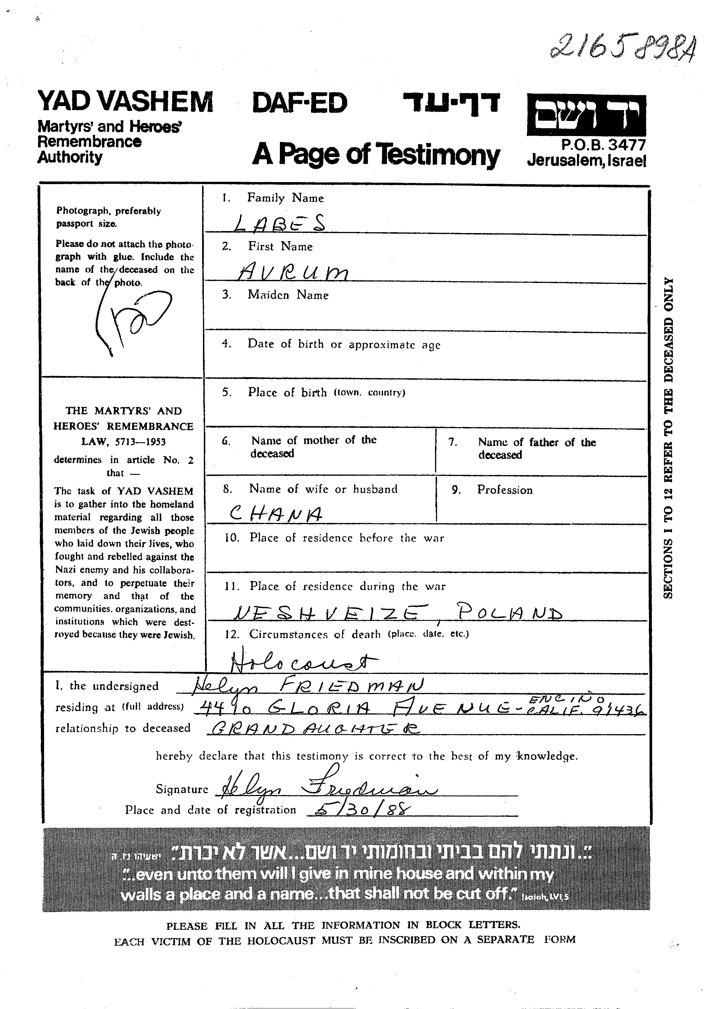 Avrum Labes. Il était Mariée à Chana. Avant la seconde guerre mondiale il vivait à Nieśwież, Pologne. Au cours de la guerre, il était à Nieśwież, Pologne.