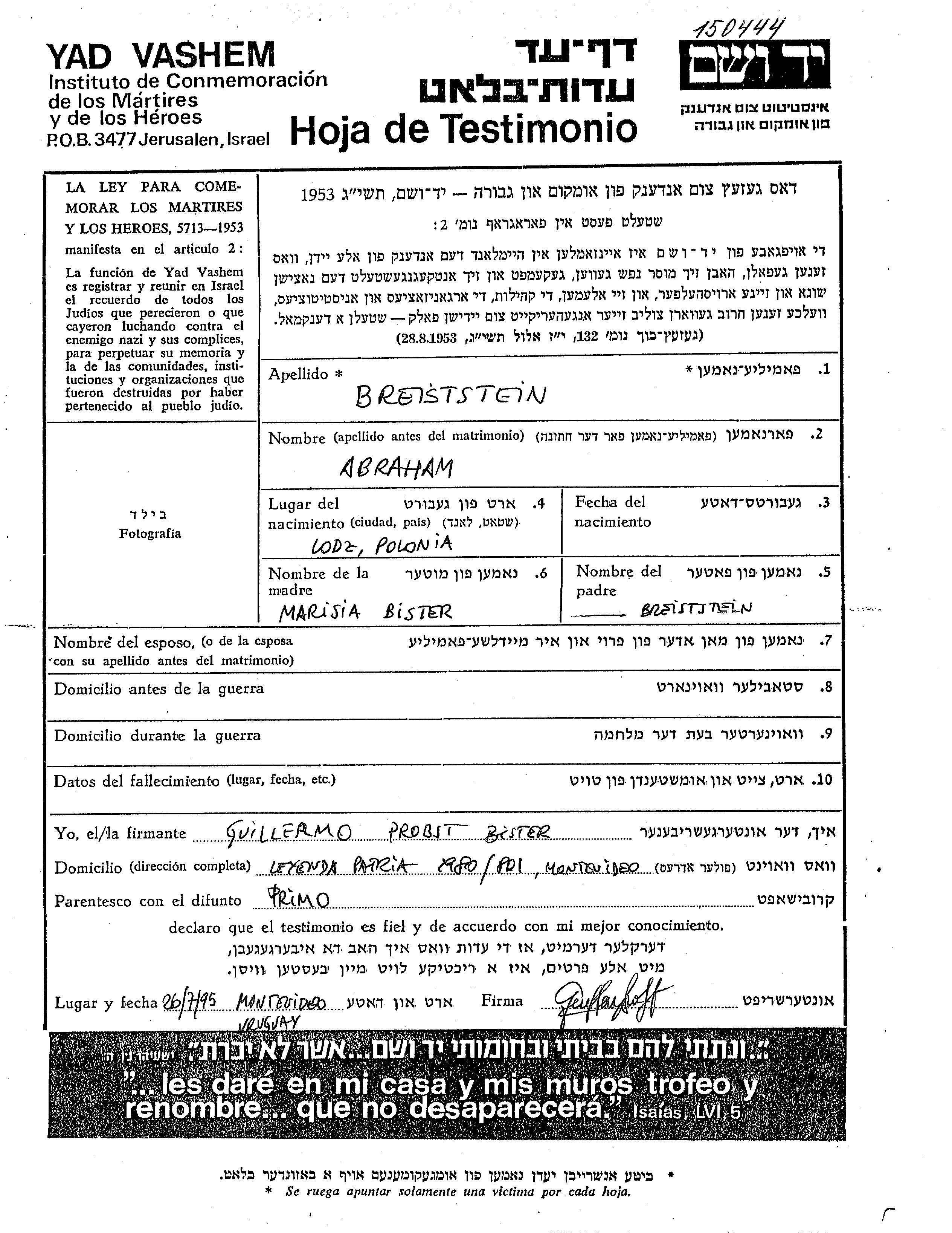 Breiststein Abraham endroit inconnu, Feuille de témoignage