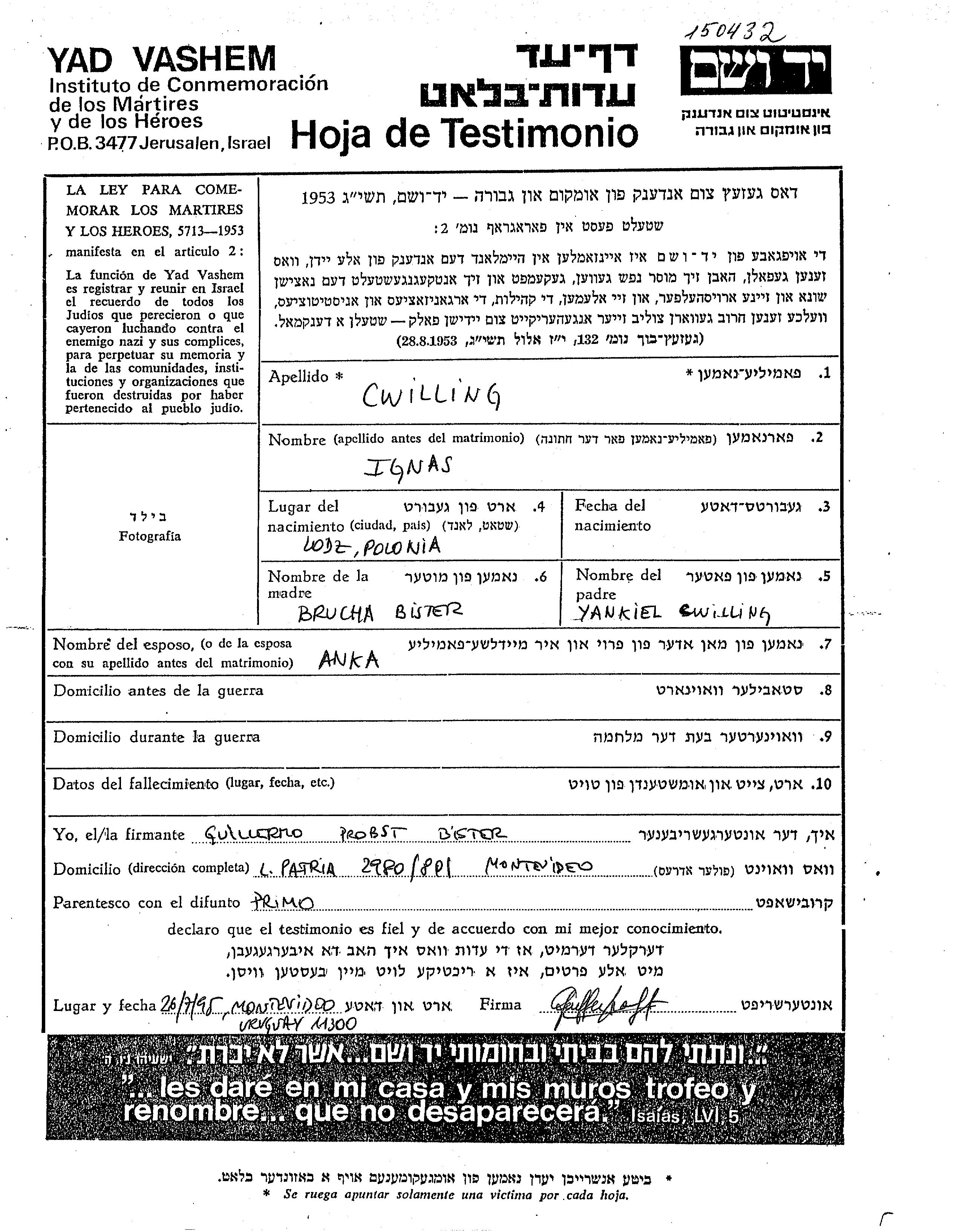 Cwilling Ignas endroit inconnu, Feuille de témoignage