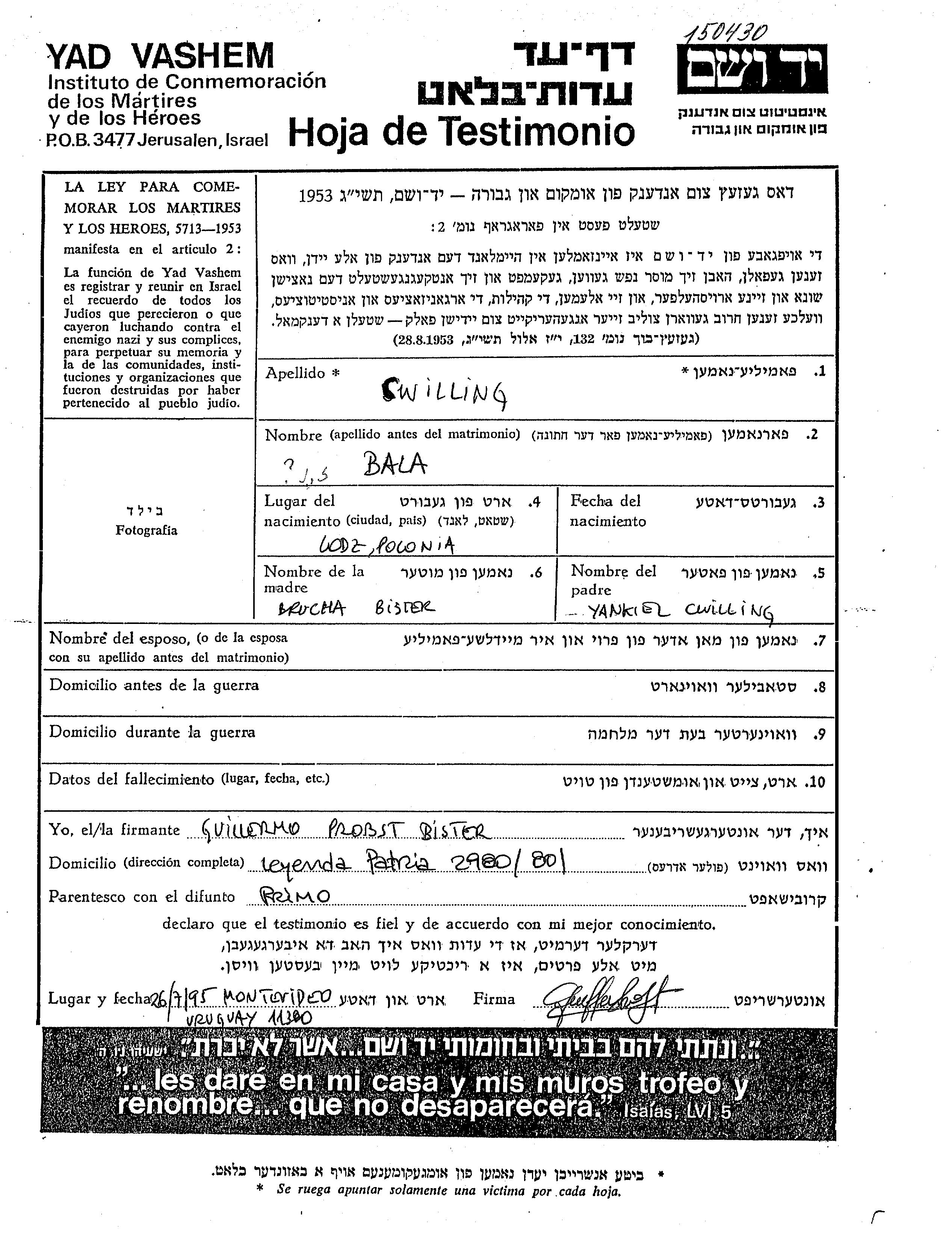 Cwilling Bala endroit inconnu, Feuille de témoignage