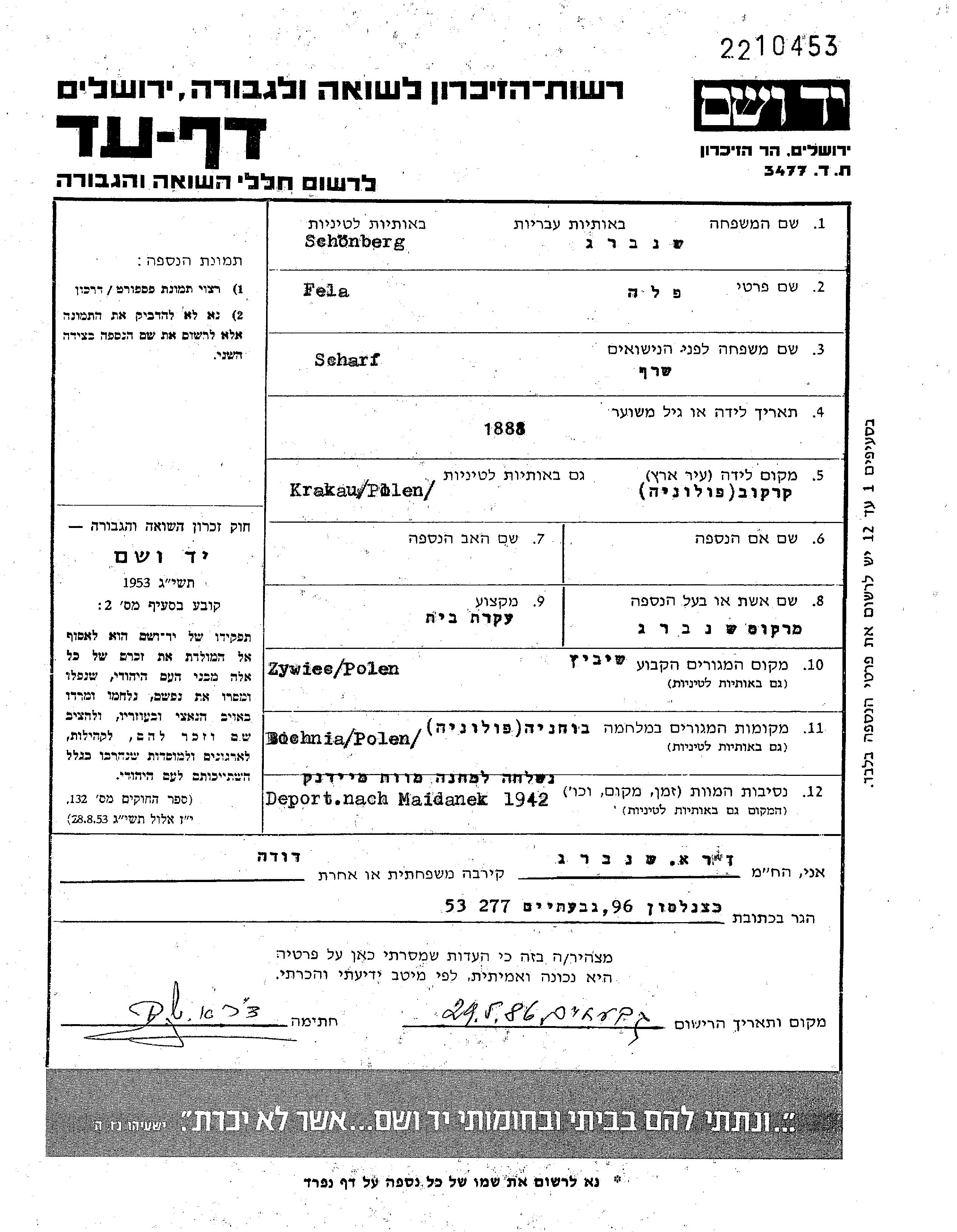 Fela Schoenberg née Scharf est née à Krakow, Pologne en 1888. Elle était Femme au foyer et Mariée à Markus. Avant la seconde guerre mondiale elle vivait à Zywiec, Pologne. Pendant la guerre, elle était à Bochnia, Pologne.