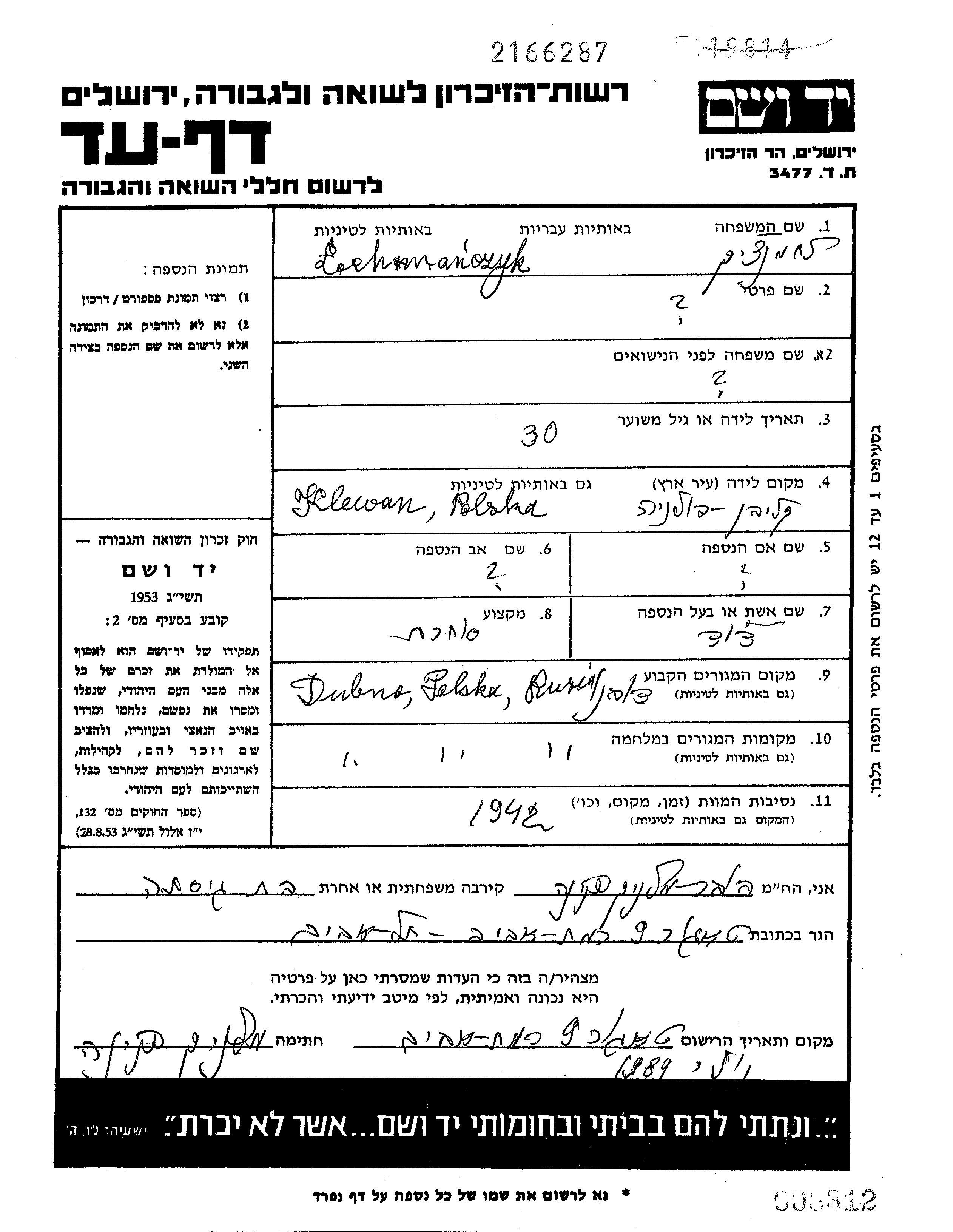 Lachmanczyk prénom inconnu Dubno, Pologne Feuille de témoignage