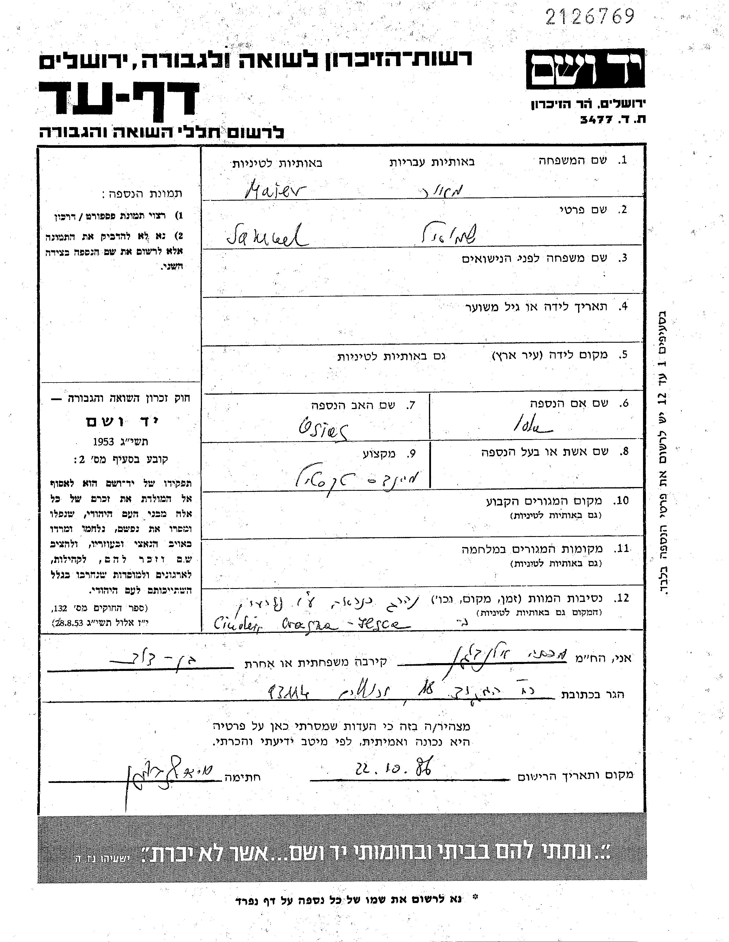 Maier Shmuel endroit inconnu, Feuille de témoignage