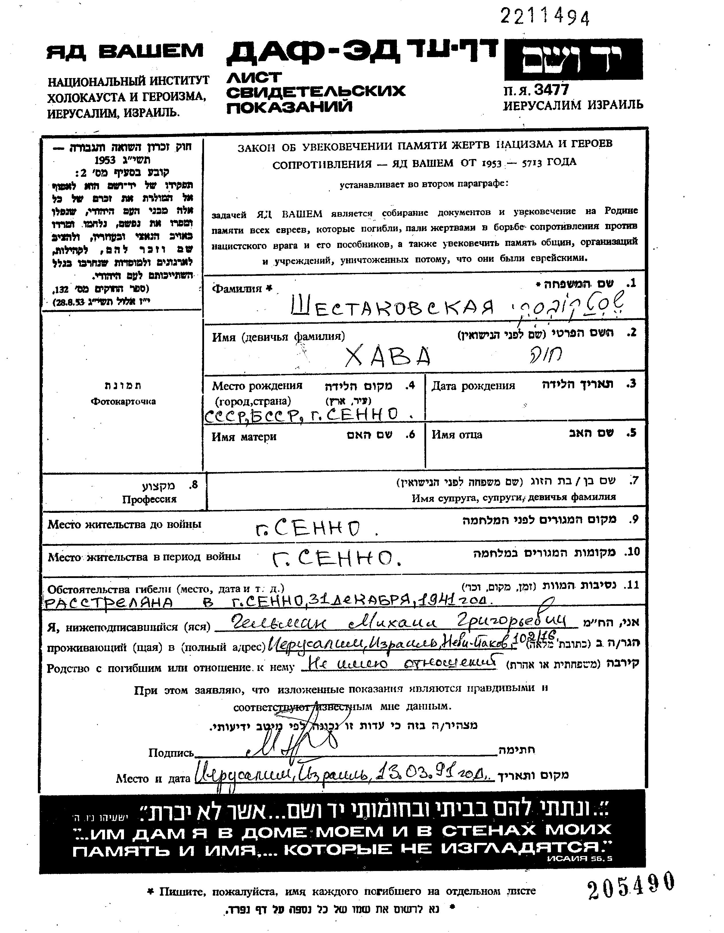Shestakovski Khava Senno, Bélorussie (URSS) Feuille de témoignage