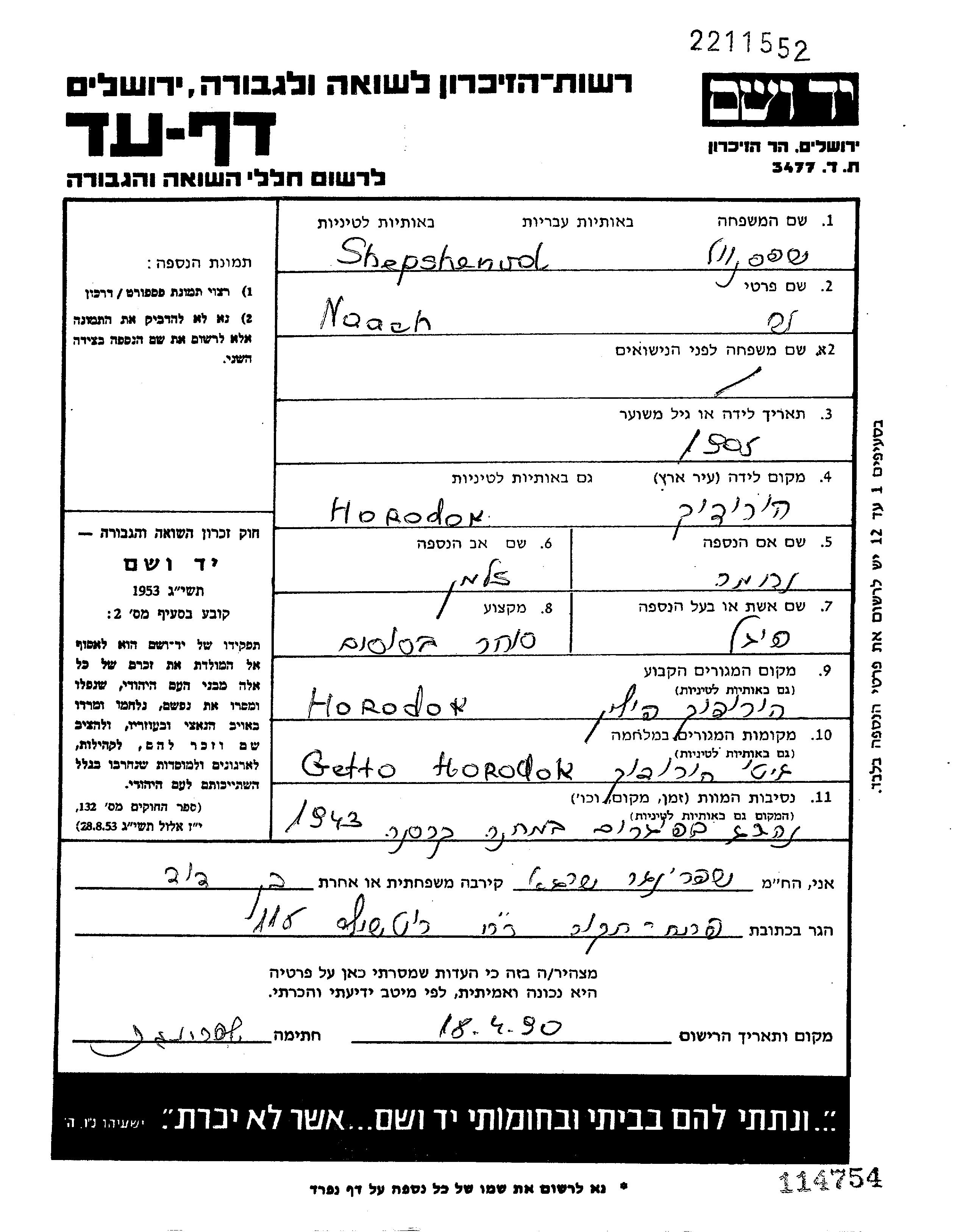 Shepshenvol Noach Horodek, Pologne Feuille de témoignage