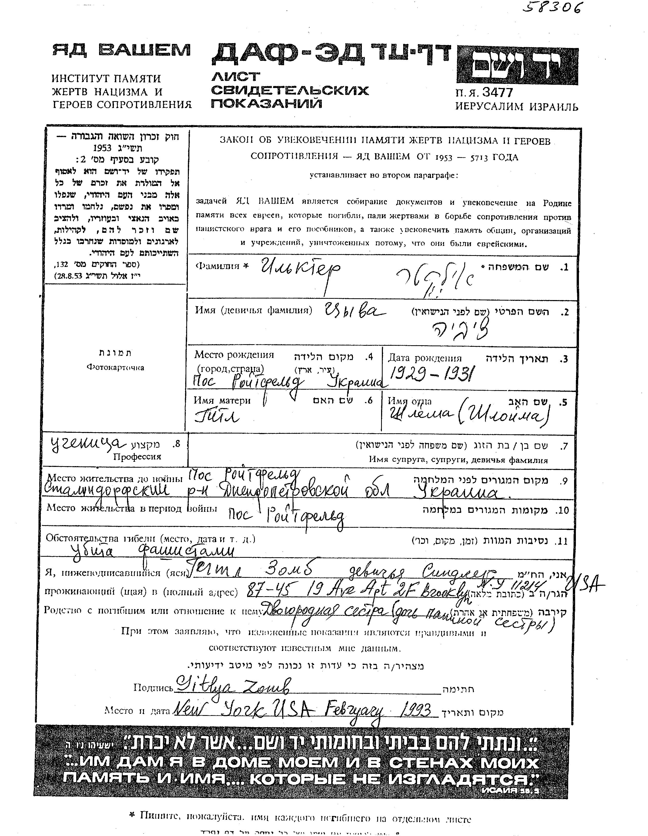 Ilkter Tziva 1930 Roytfeld, Ukraine (URSS) Feuille de témoignage