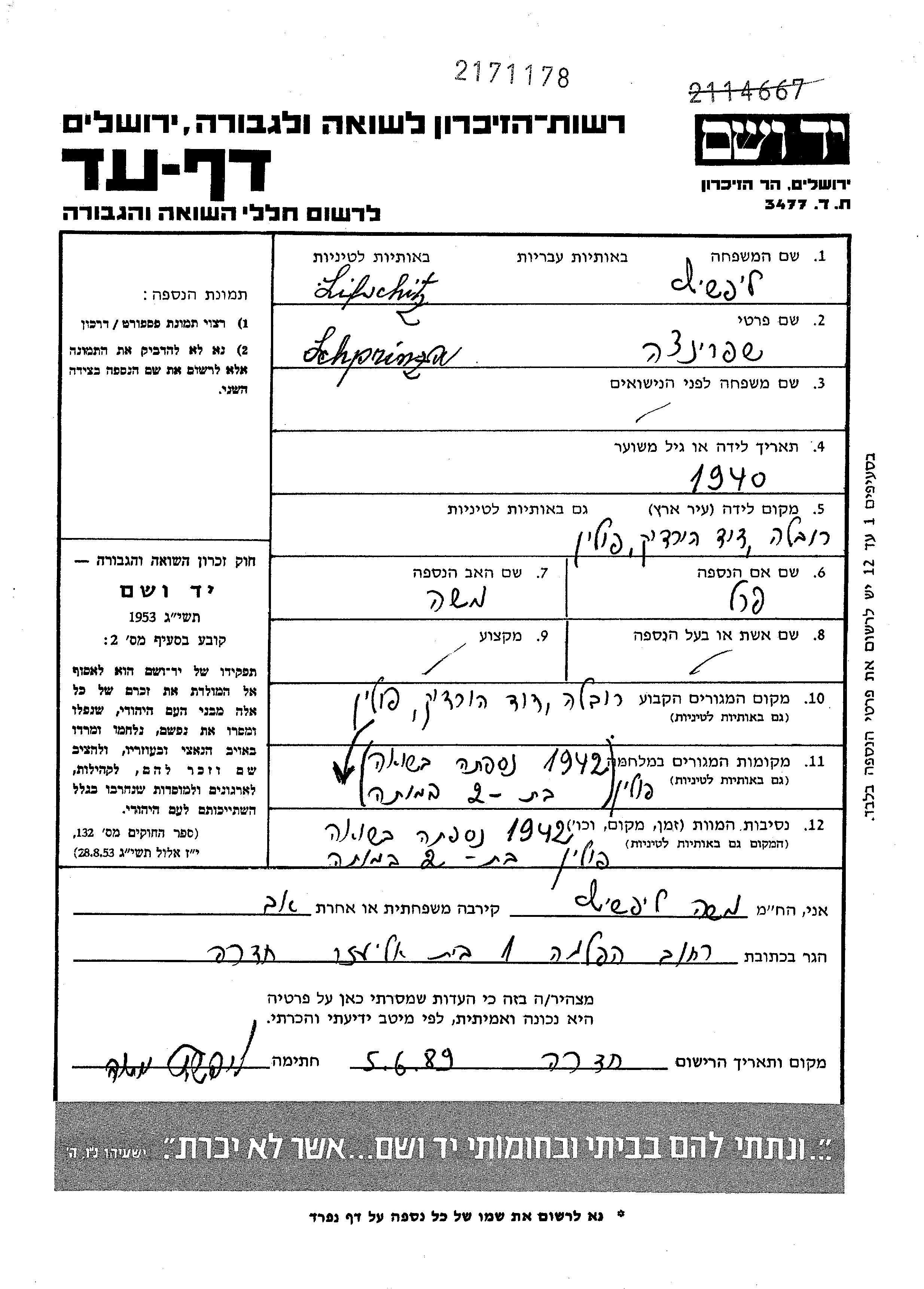 Lifschitz Schprinza 1940 David Horodok, Pologne Feuille de témoignage