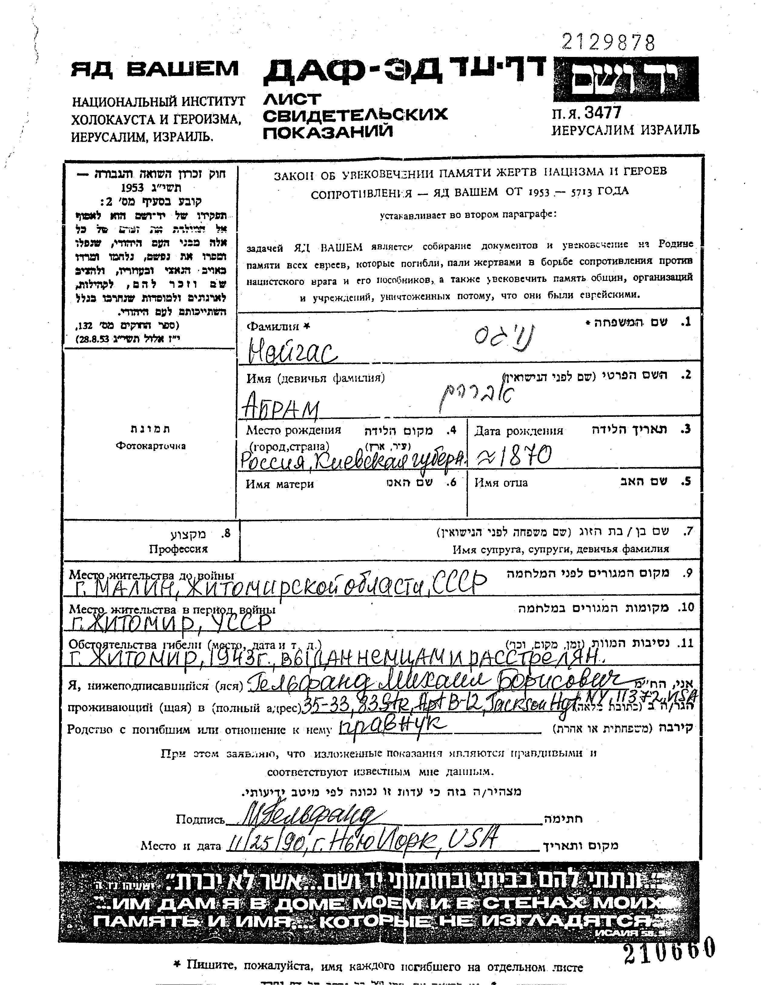 Noigas Abram 1870 Malin, Ukraine (URSS) Feuille de témoignage