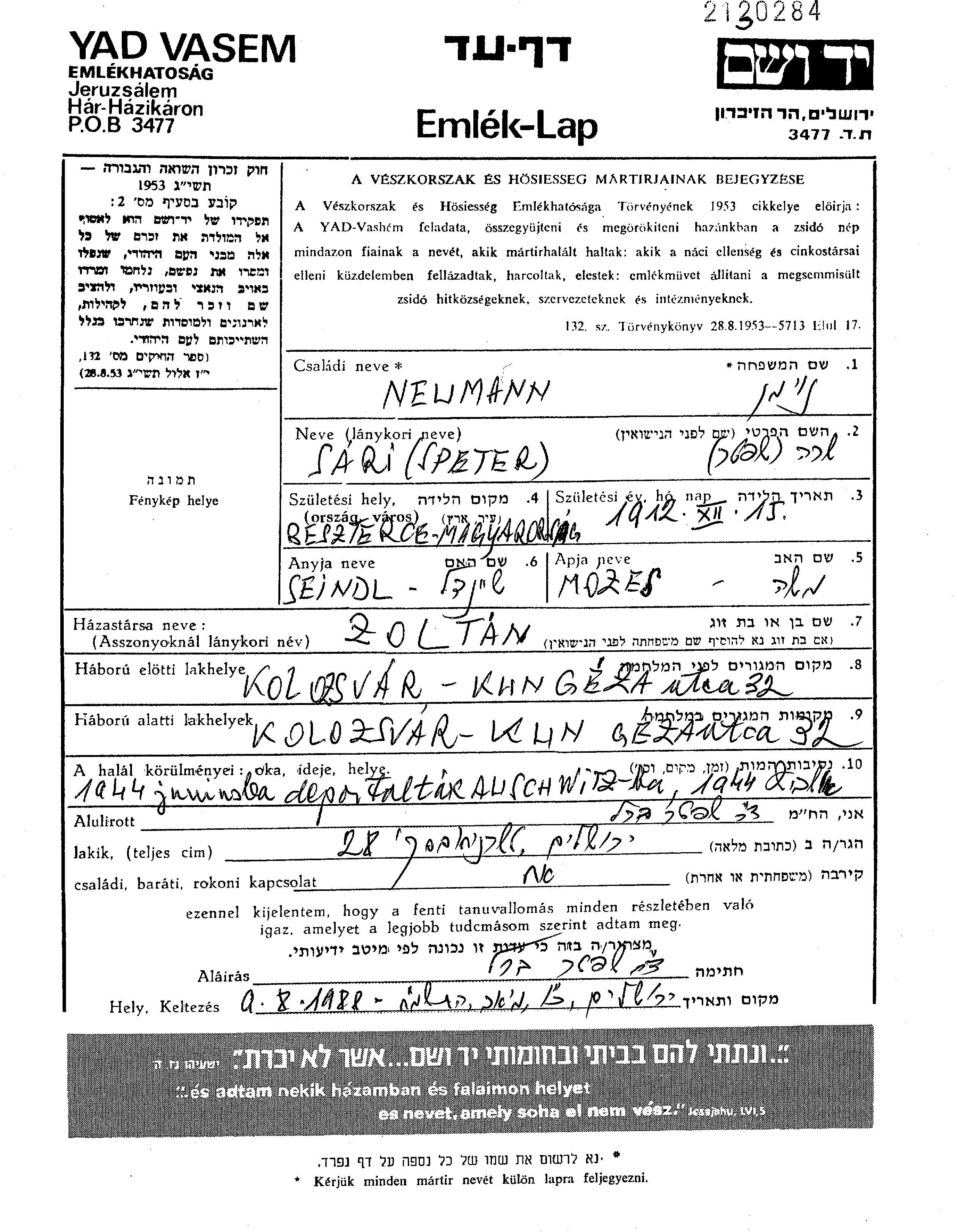 Sari Neumann née Speter est née à Beszterce, Roumanie en 1912, fille de Moshe et de Seindl. Elle était Mariée à Zoltan. Avant la seconde guerre mondiale elle vivait à Kolozsvar, Roumanie. Pendant la guerre, elle était à Kolozsvar, Roumanie.