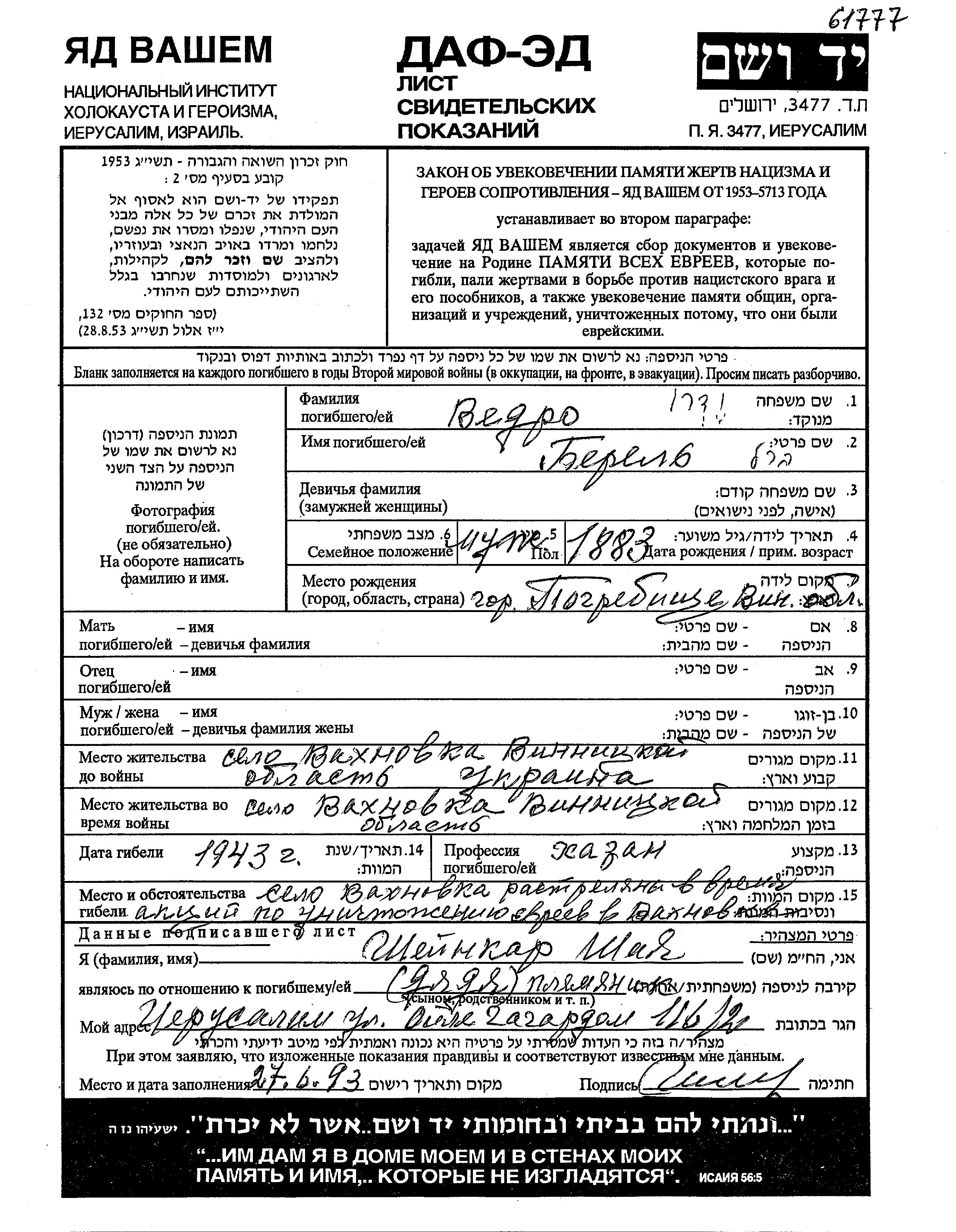 Vedro Berl 1883 Vakhnovka, Ukraine (URSS) Feuille de témoignage