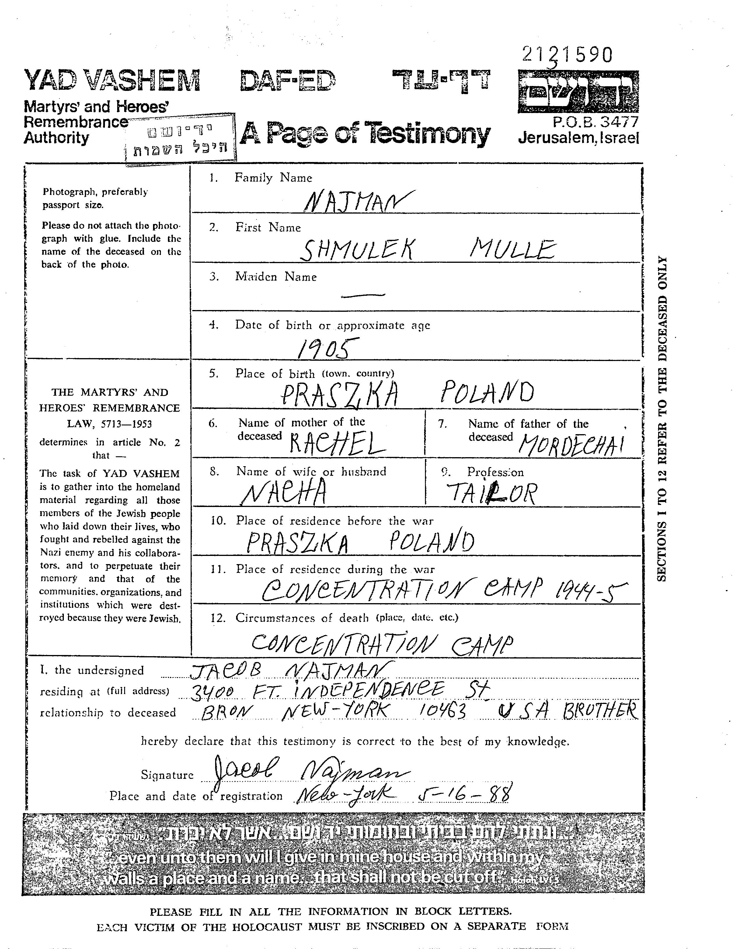 Najman Shmulek 1905 Praszka, Pologne Feuille de témoignage