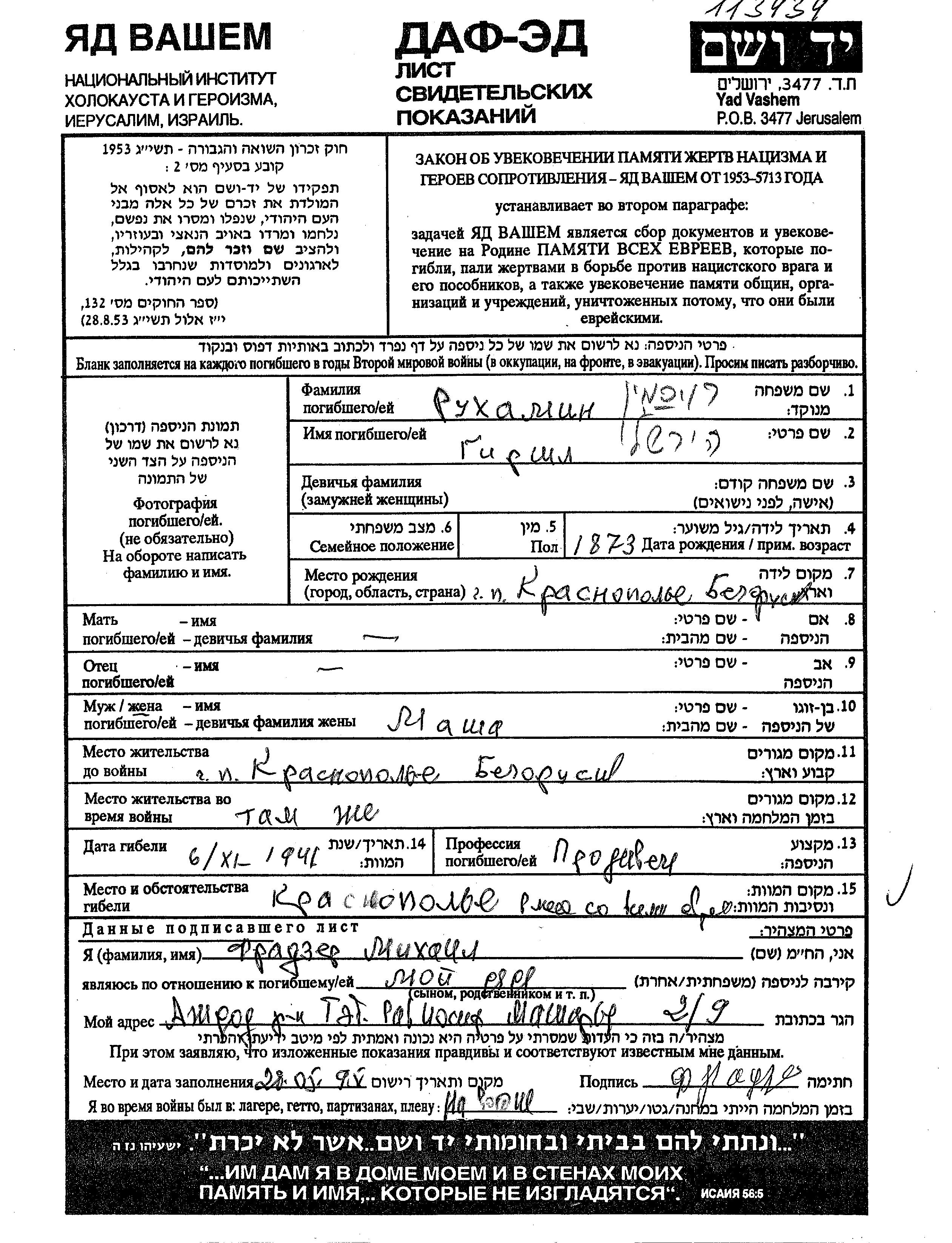 Rukhamin Rokhman Girshl 1873 Krasnopolye, Bélorussie (URSS) Feuille de témoignage