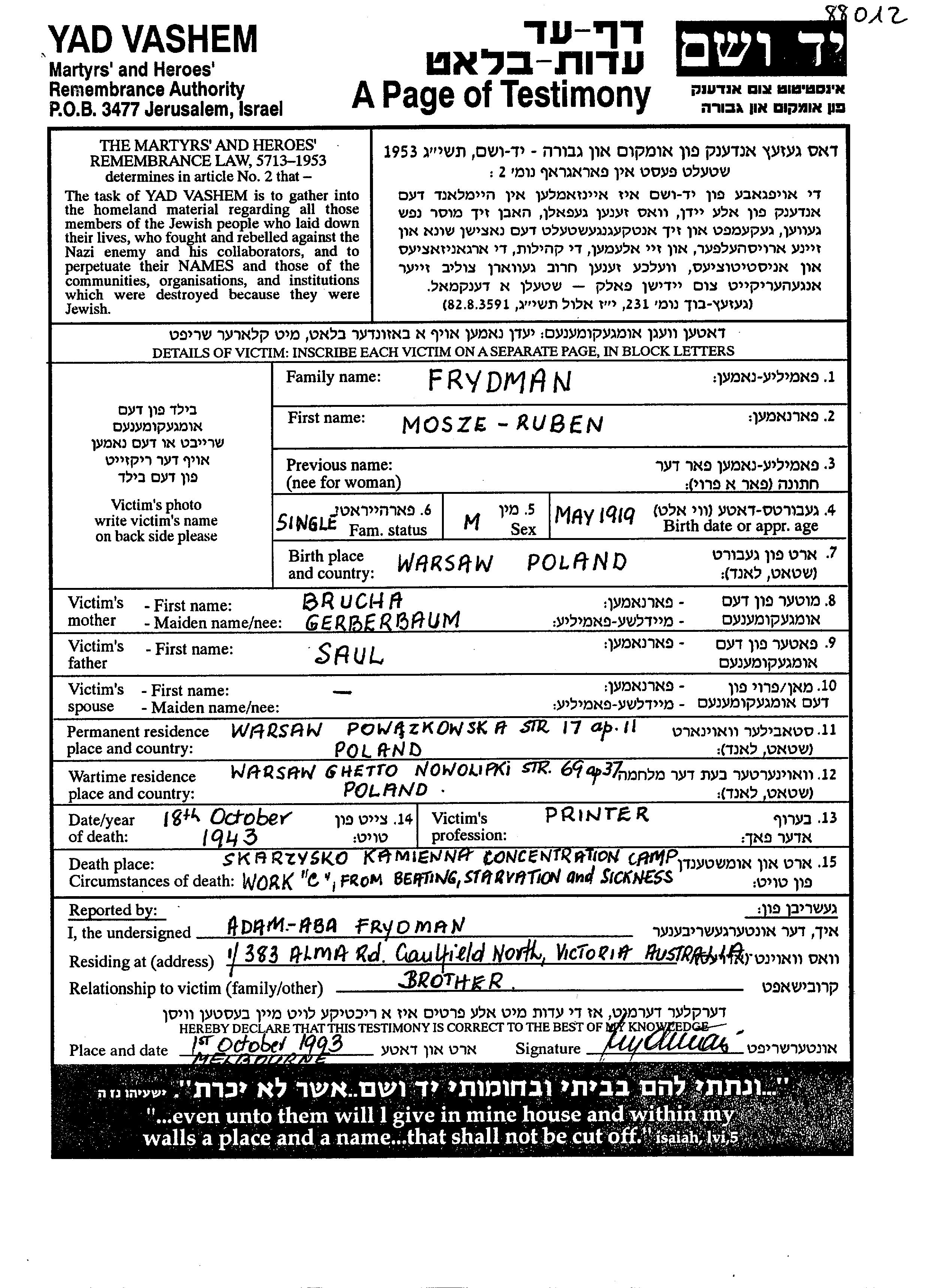 Frydman Mosze Reuven 1919 Warszawa, Pologne Feuille de témoignage