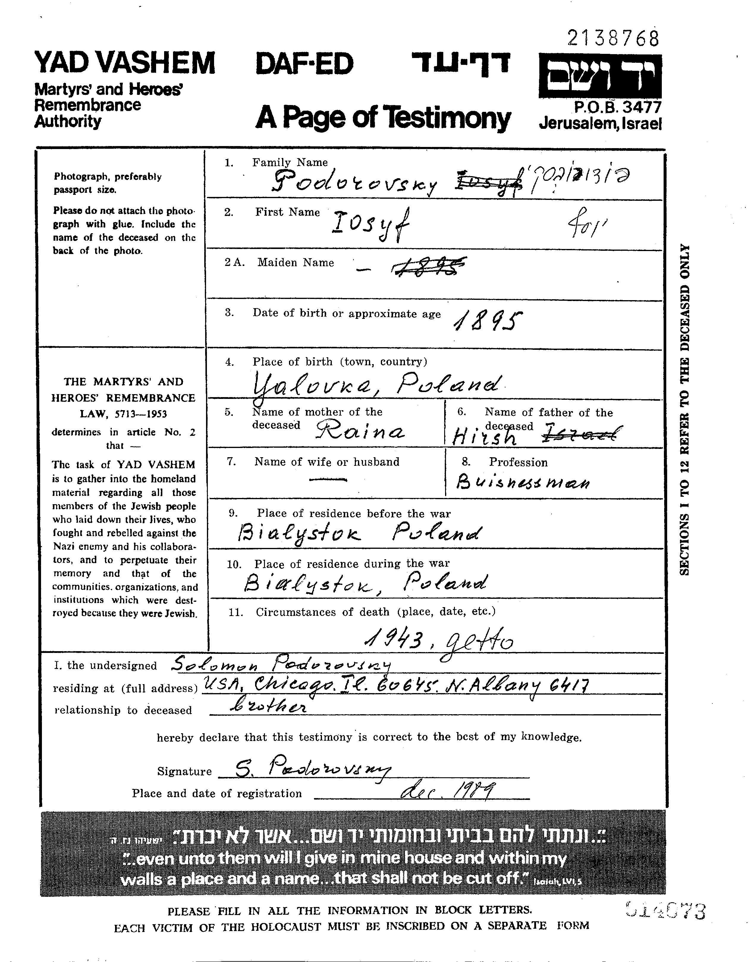 Iosyf Podorovsky est né à Jalowka, Pologne, fils de Hirsh et de Raina. Il était Homme d'affaire. Avant la seconde guerre mondiale il vivait à Bialystok, Pologne. Au cours de la guerre, il était à Bialystok, Pologne.