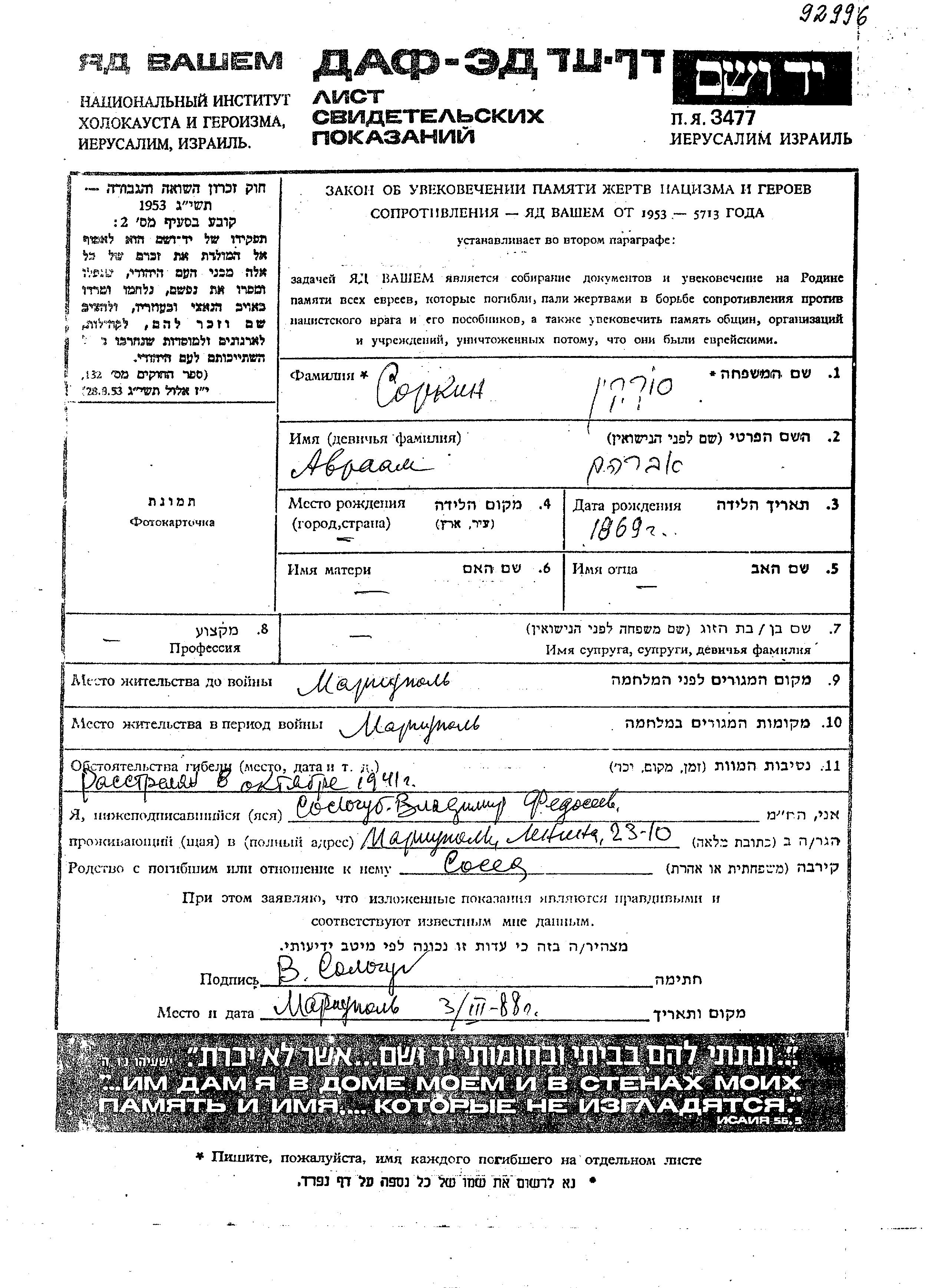 Sorkin Avraam 1869 Mariupol, Ukraine (URSS) Feuille de témoignage