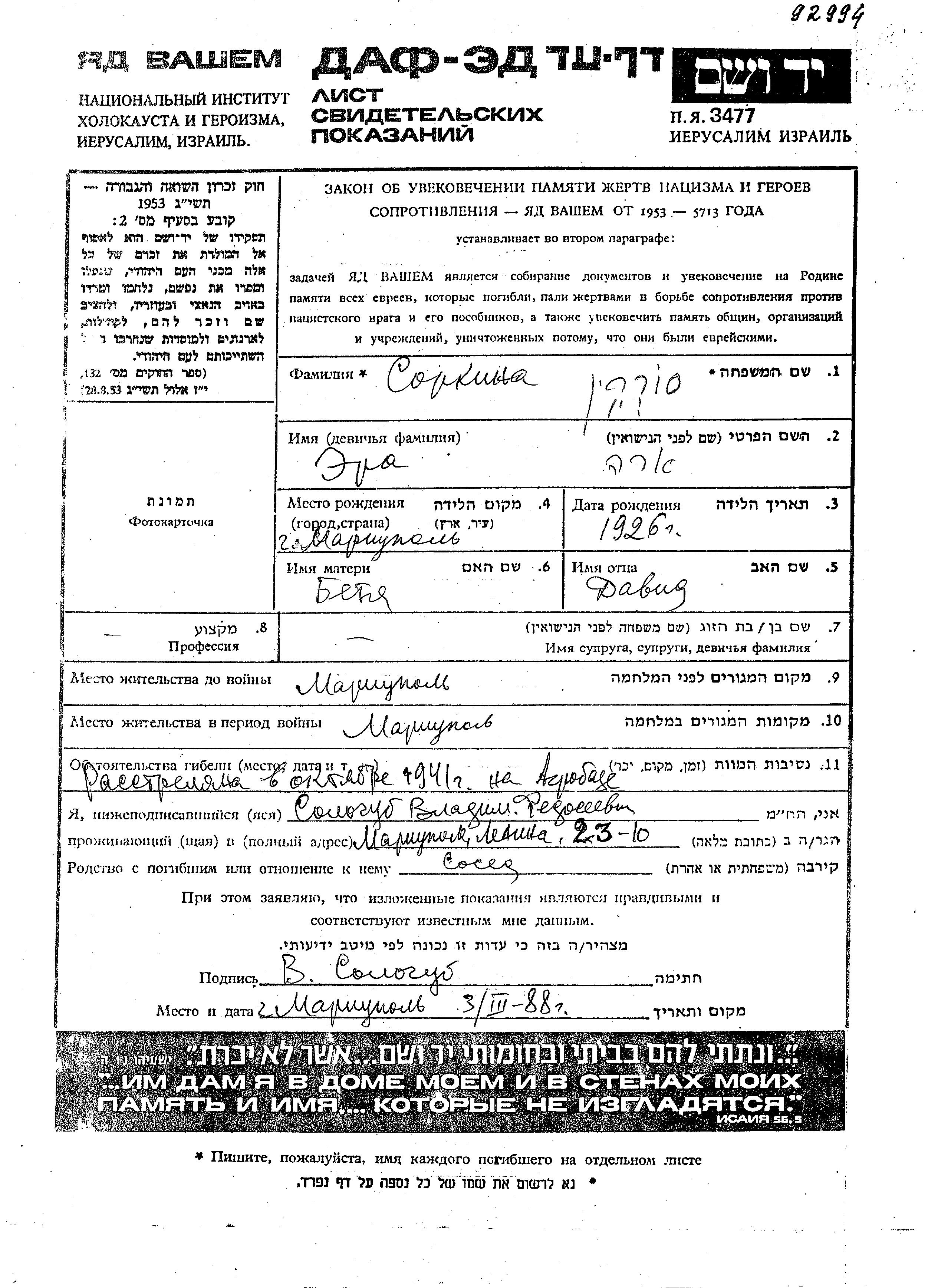 Era Sorkin est née à Mariupol, Ukraine (URSS) en 1926, fille de David et de Betia. Elle était Enfant. Avant la seconde guerre mondiale elle vivait à Mariupol, Ukraine (URSS). Pendant la guerre, elle était à Mariupol, Ukraine (URSS).
