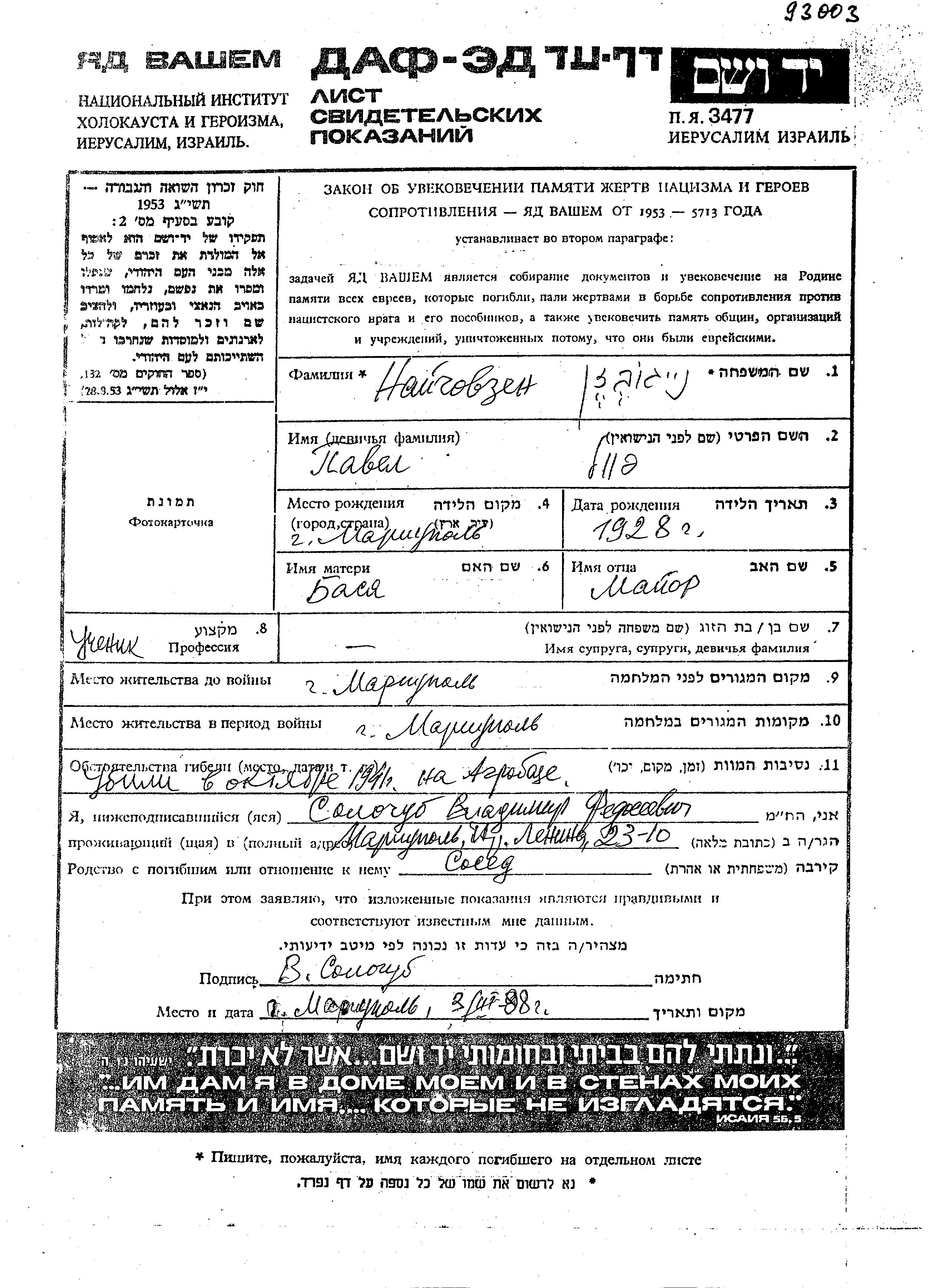 Naigovzen Pavel 1928 Mariupol, Ukraine (URSS) Feuille de témoignage